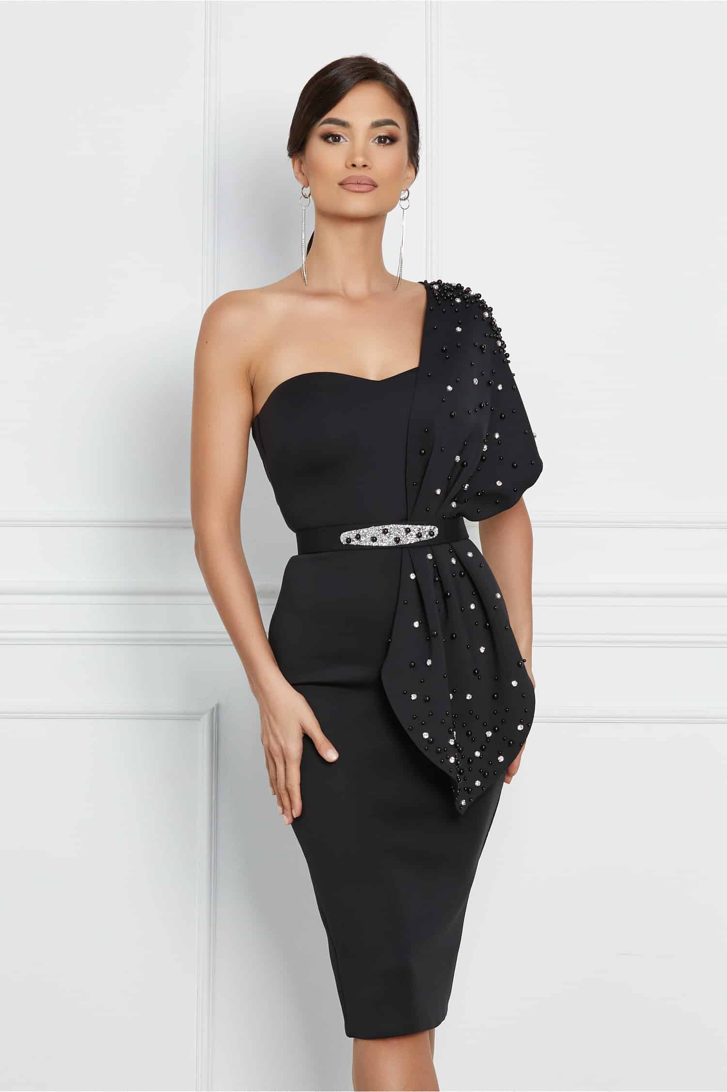 Specification: Rochie Antonia neagra din neopren cu un umar gol accesorizata cu perle