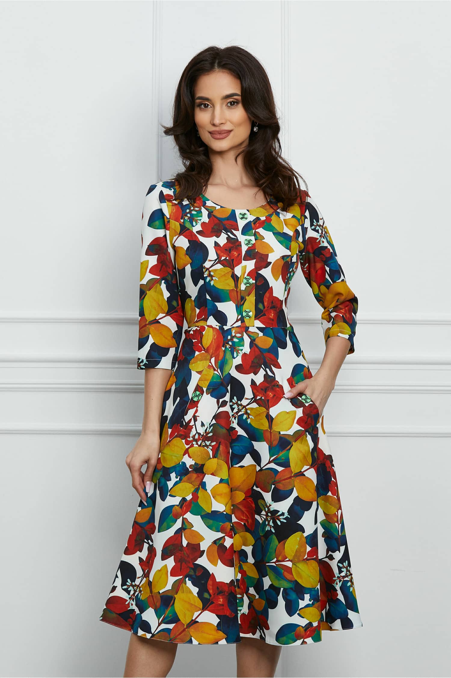 Specification: Rochie Bella alba cu imprimeu multicolor si nasturi decorativi