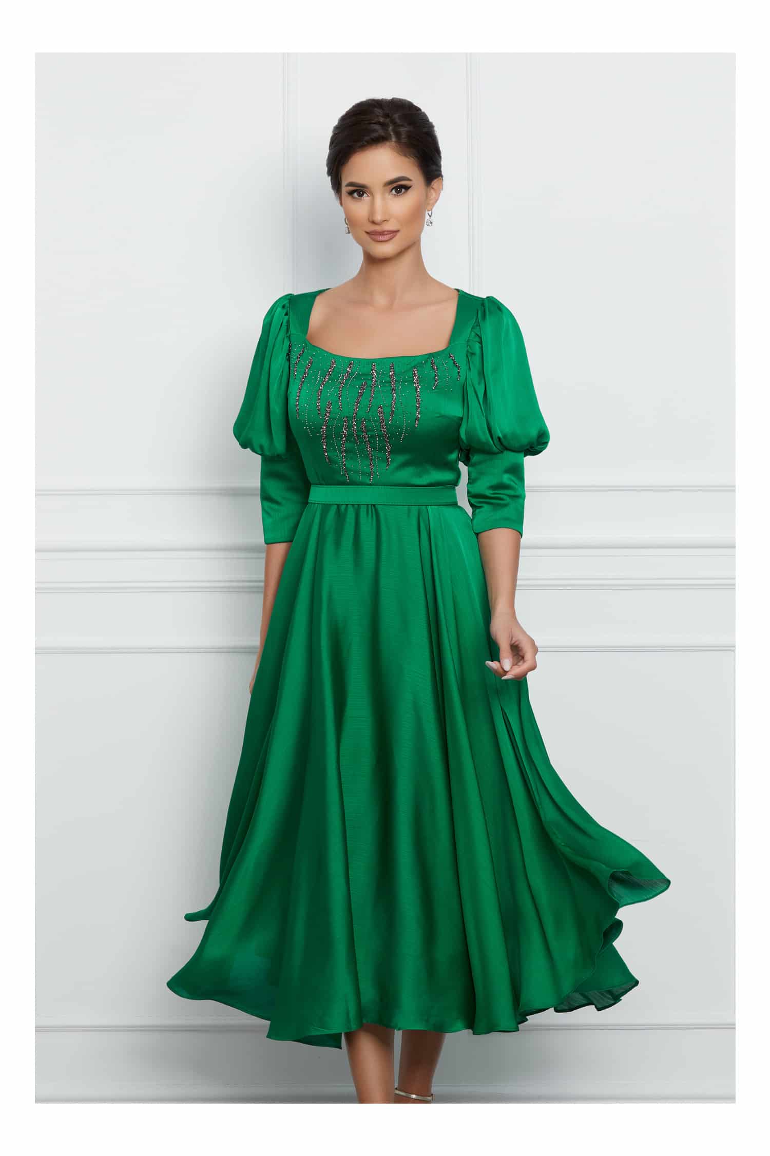 Rochie eleganta cu strasuri la bust. Are decolteu pastrat, maneci trei sferturi, croi clos, talie accesorizata cu o curea in tonul rochiei si inchidere cu fermoar la spate.  Rochie eleganta Strasuri la bust Decolteu patrat Cupe Maneci trei sferturi Curea in talie Croi clos Are captuseala Rijelina la baza Inchidere cu fermoar la spate Material: voal satinat  Compozitie: 95% poliester, 10% elastan Instructiuni de intretinere:     *Va rugam verificati eticheta produsului inainte de curatare! *Modelul are inaltimea de 174 cm. *Va rugam sa retineti ca o usoara discrepanta de culoare ar trebui sa fie acceptabila datorita luminii si luminozitatii ecranului.  *Va rugam verificati ghidul de marimi, in cm, pentru a alege corect marimea. Â