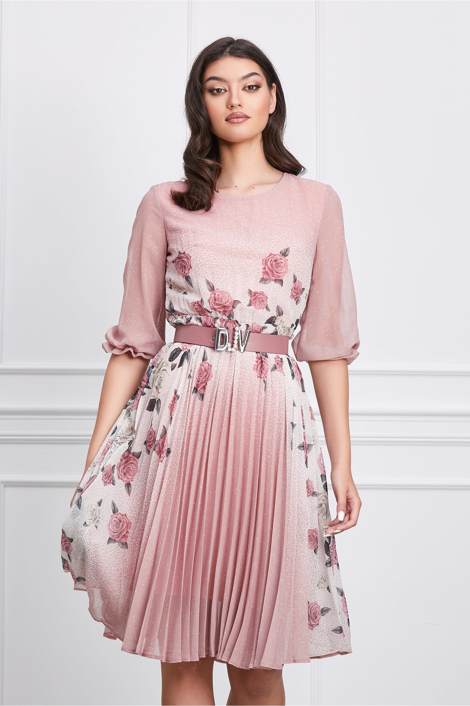 Specification: Rochie Corina roz cu imprimeu floral si curea in talie