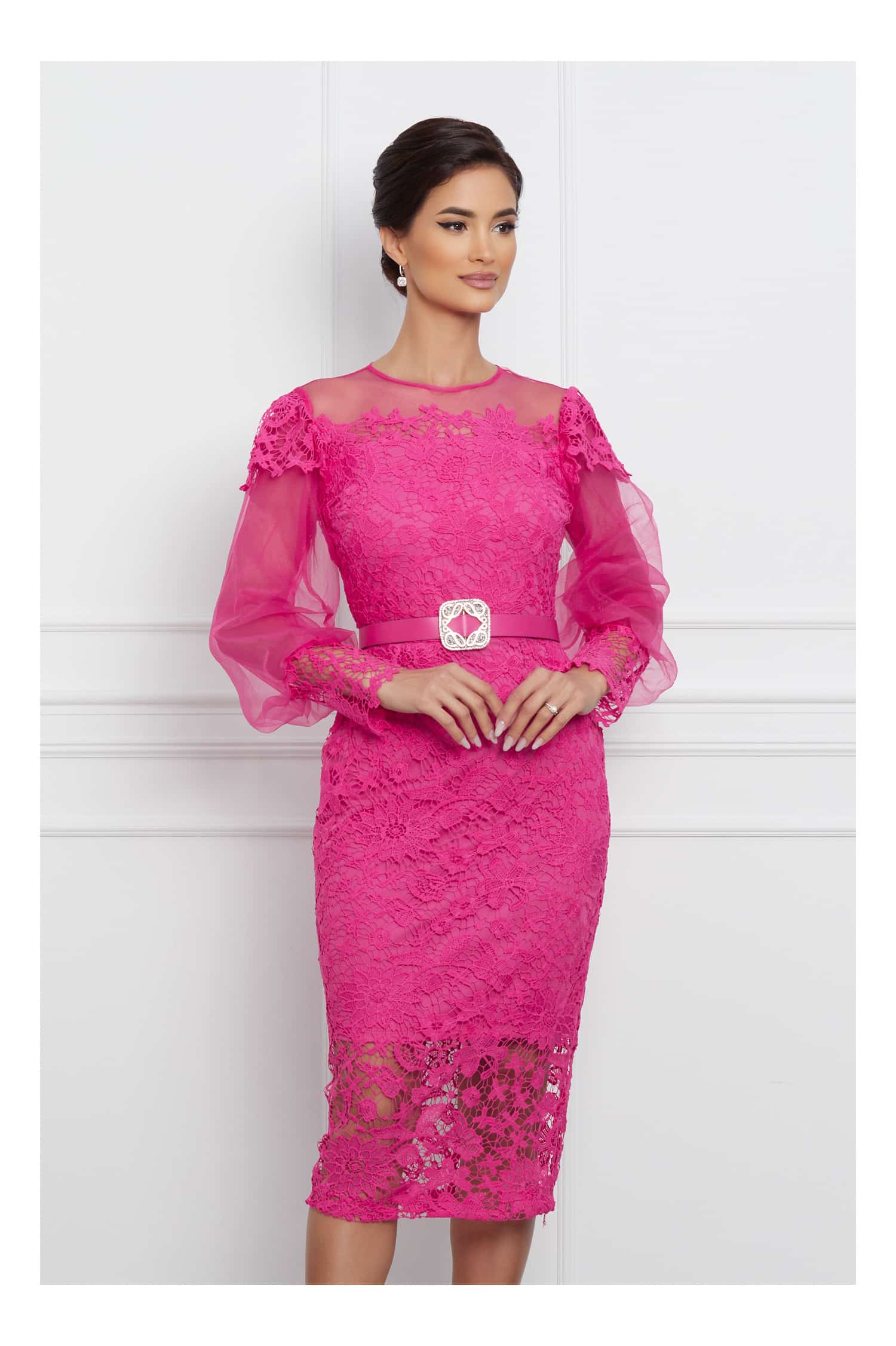Specification: Rochie Dana fucsia din dantela cu maneci din organza si curea in talie