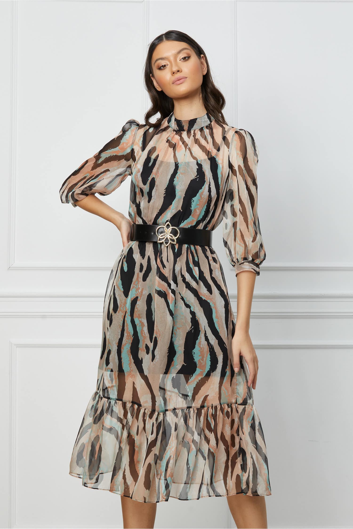Specification: Rochie Daniela bej cu zebra print verde mint si curea in talie