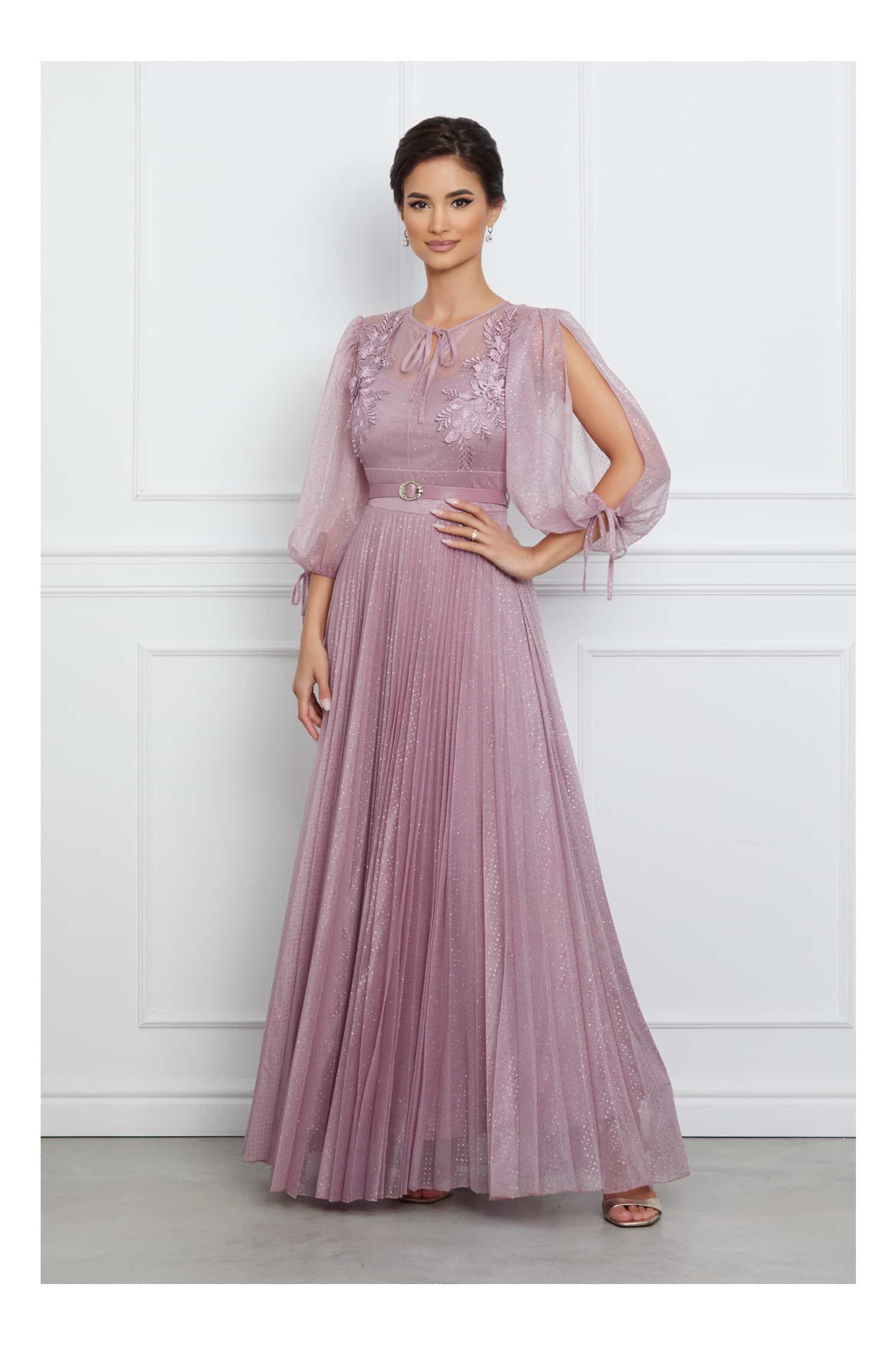 Specification: Rochie Daria lunga lila cu broderie la bust si curea in talie