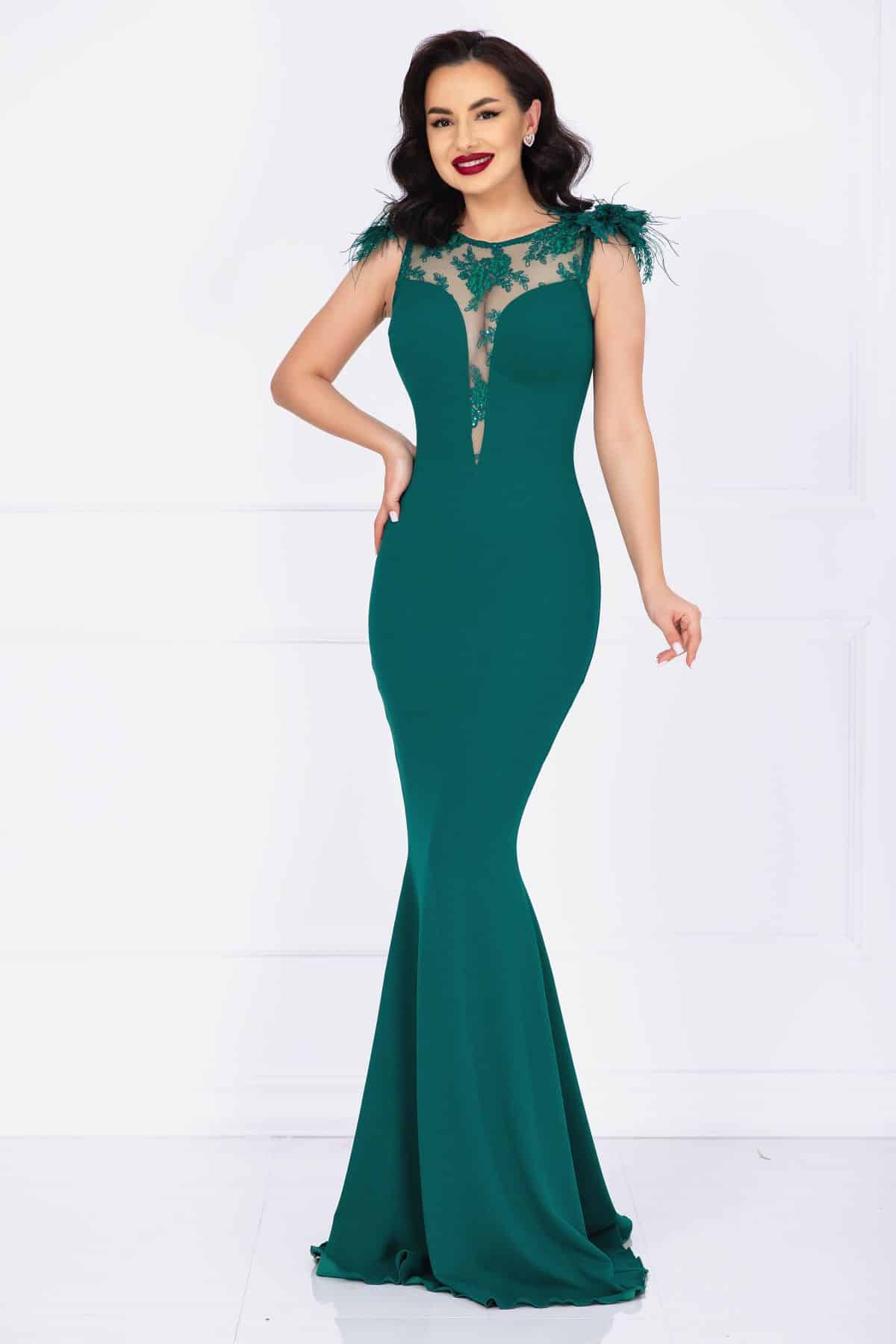 Specification: Rochie de lux Kathrin sirena verde cu flori 3D la umeri si fulgi