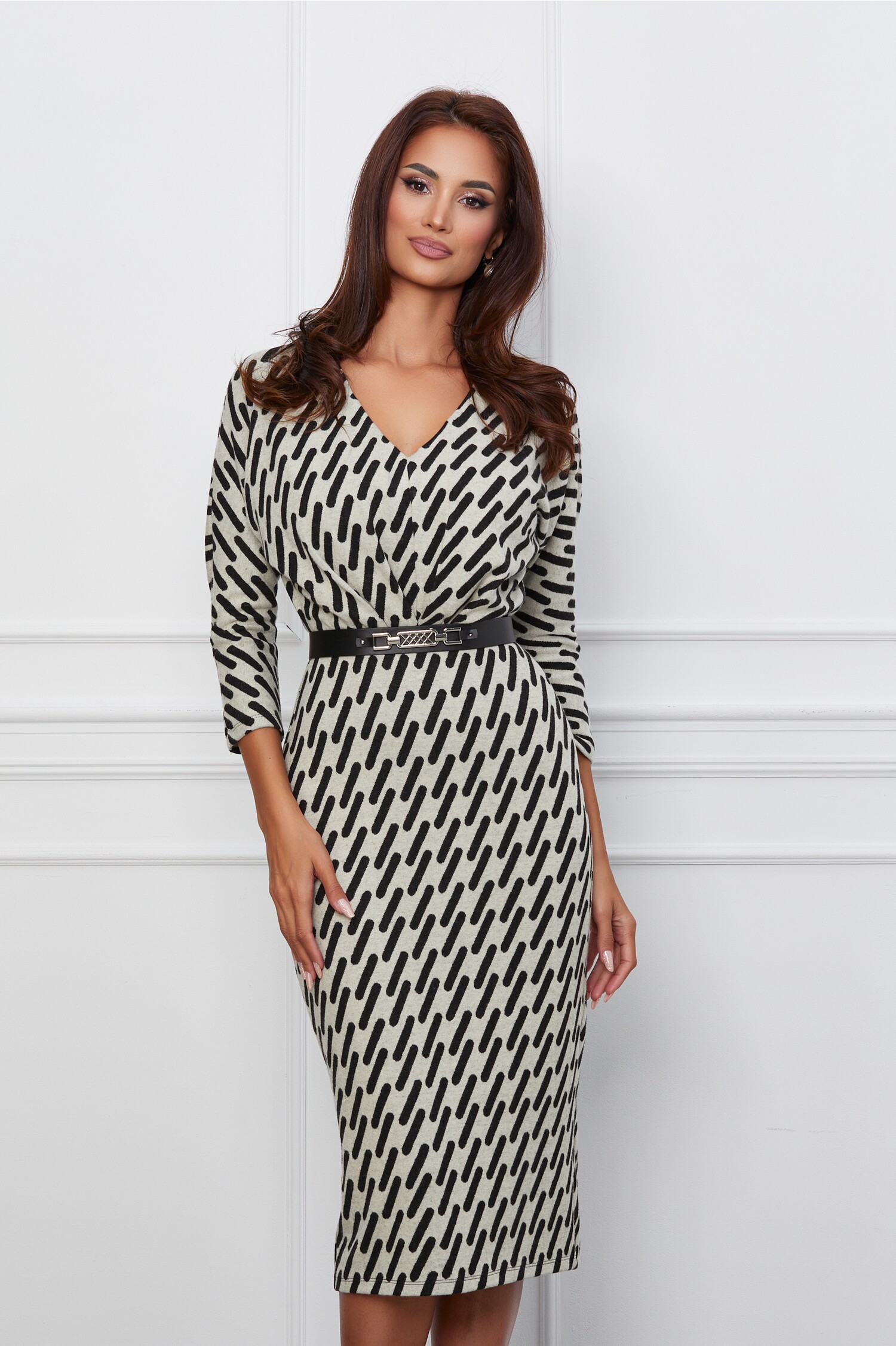 Specification: Rochie Dora ivory cu imprimeuri negre si curea in talie
