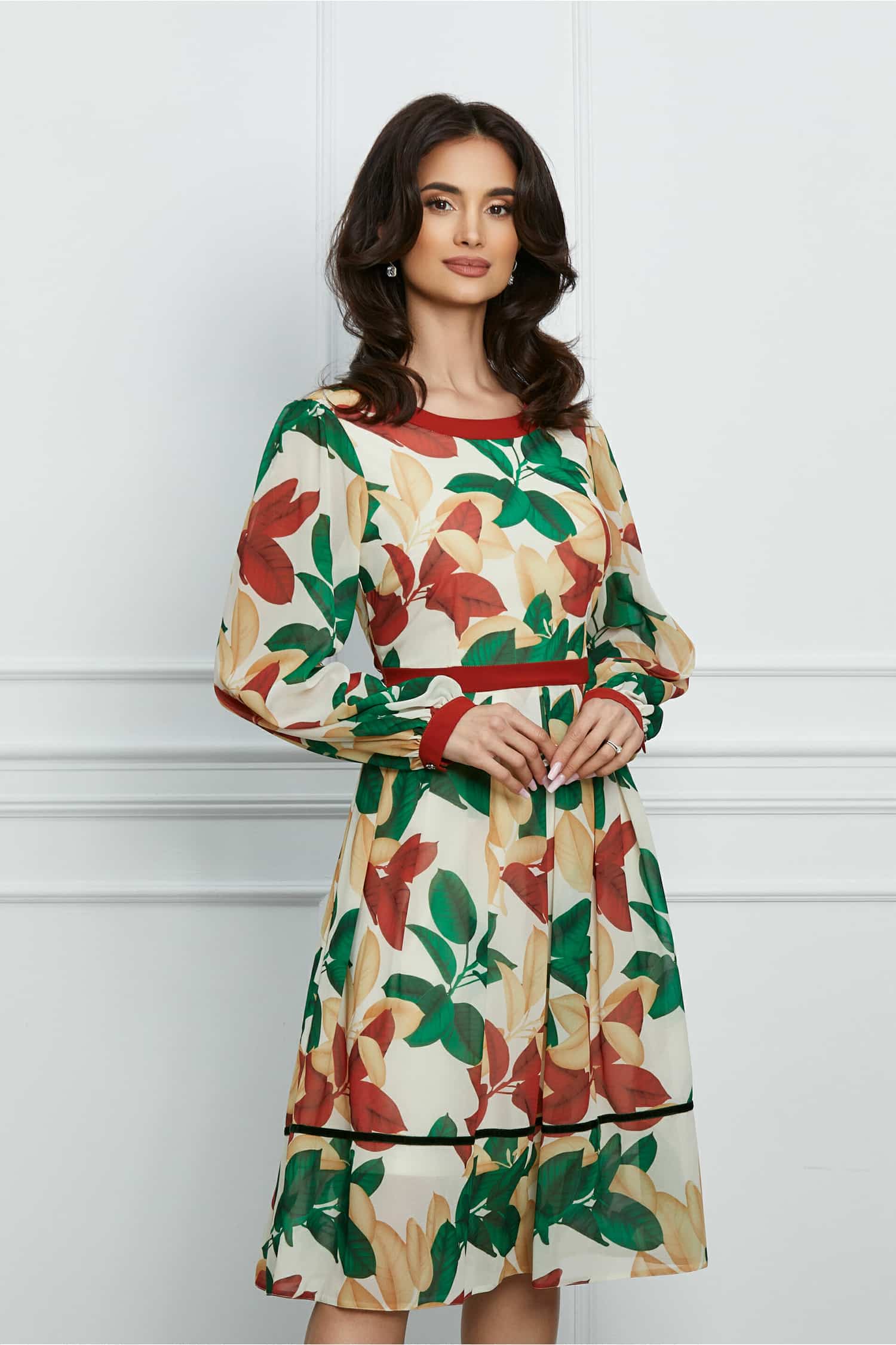 Specification: Rochie Dorina ivory cu frunze maro si pliuri pe fusta