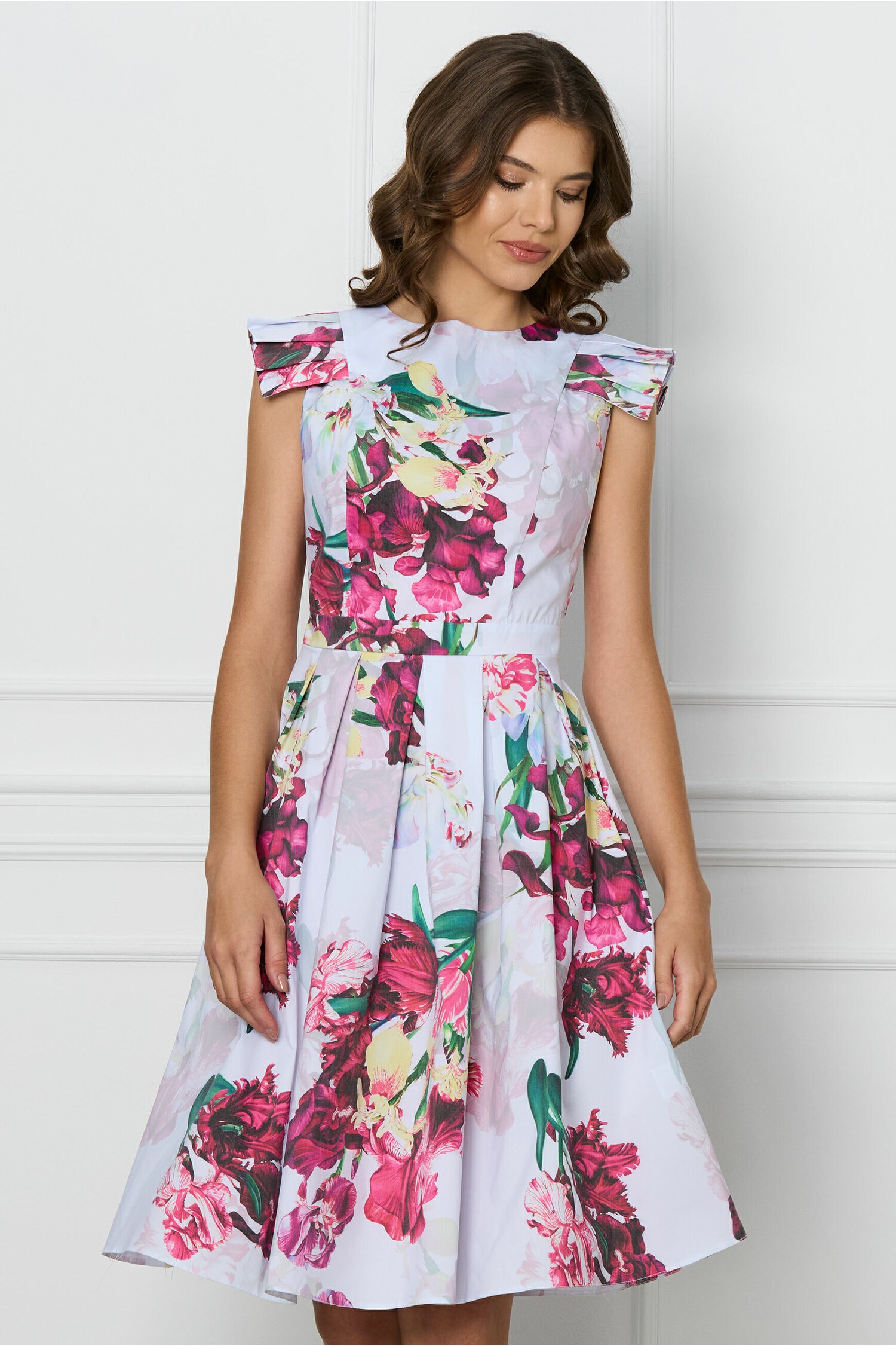 Specification: Rochie DY Fashion alba cu imprimeuri magenta si maneci scurte evantai