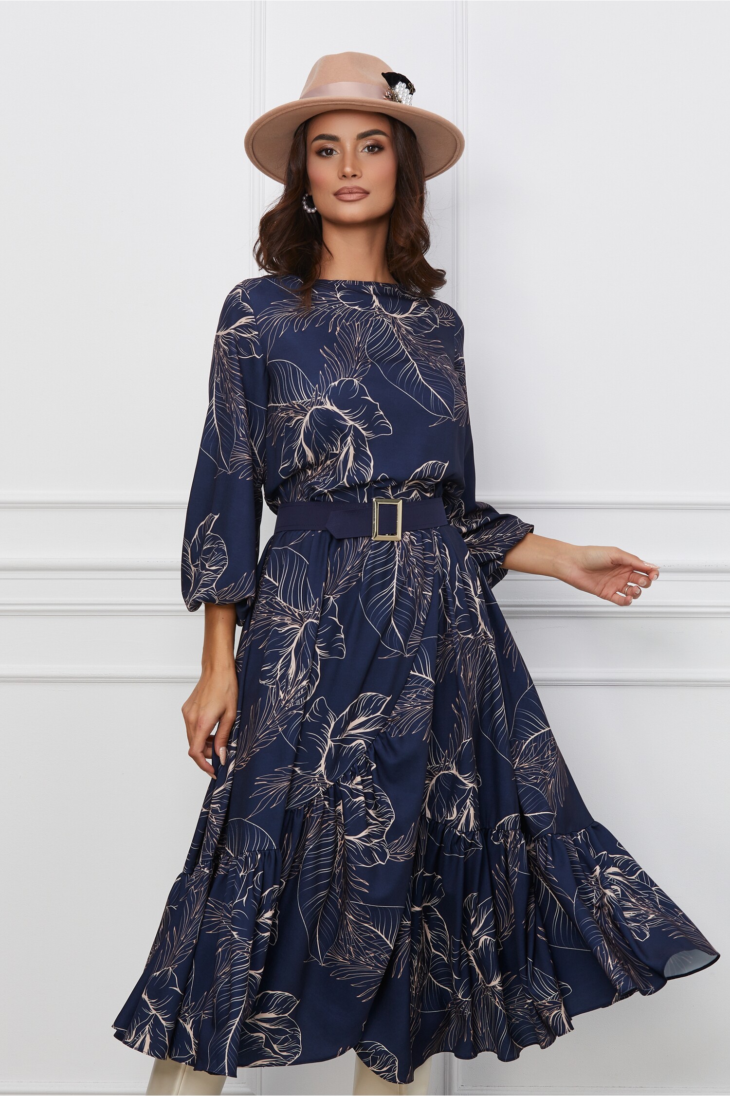 Rochie Dy Fashion bleumarin cu imprimeuri bej si curea in talie! Transport si retur gratuite la orice comanda!! Transport si retur gratuite la orice comanda!
