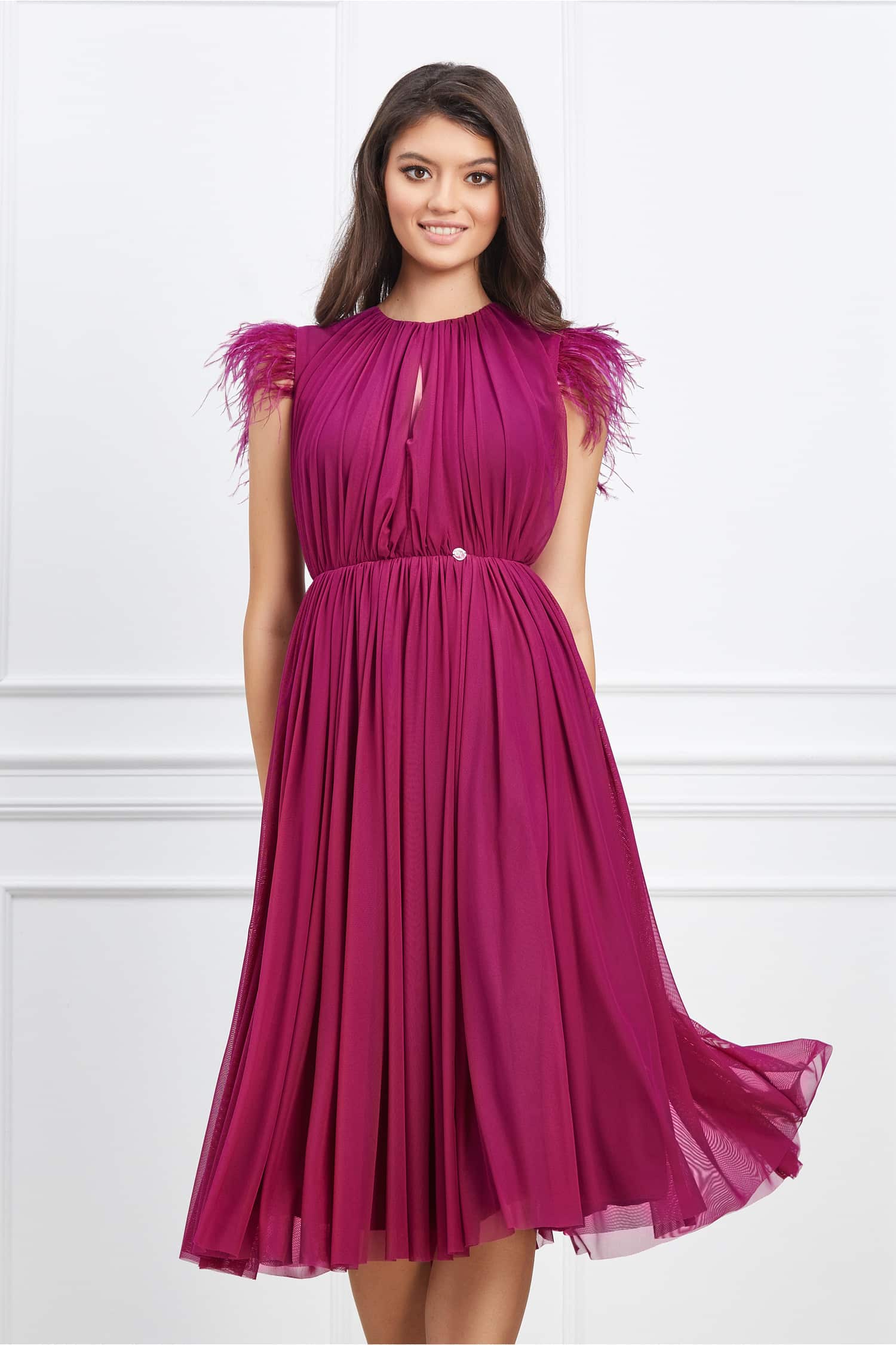 Rochie Dy Fashion bordo cu pene la umeri