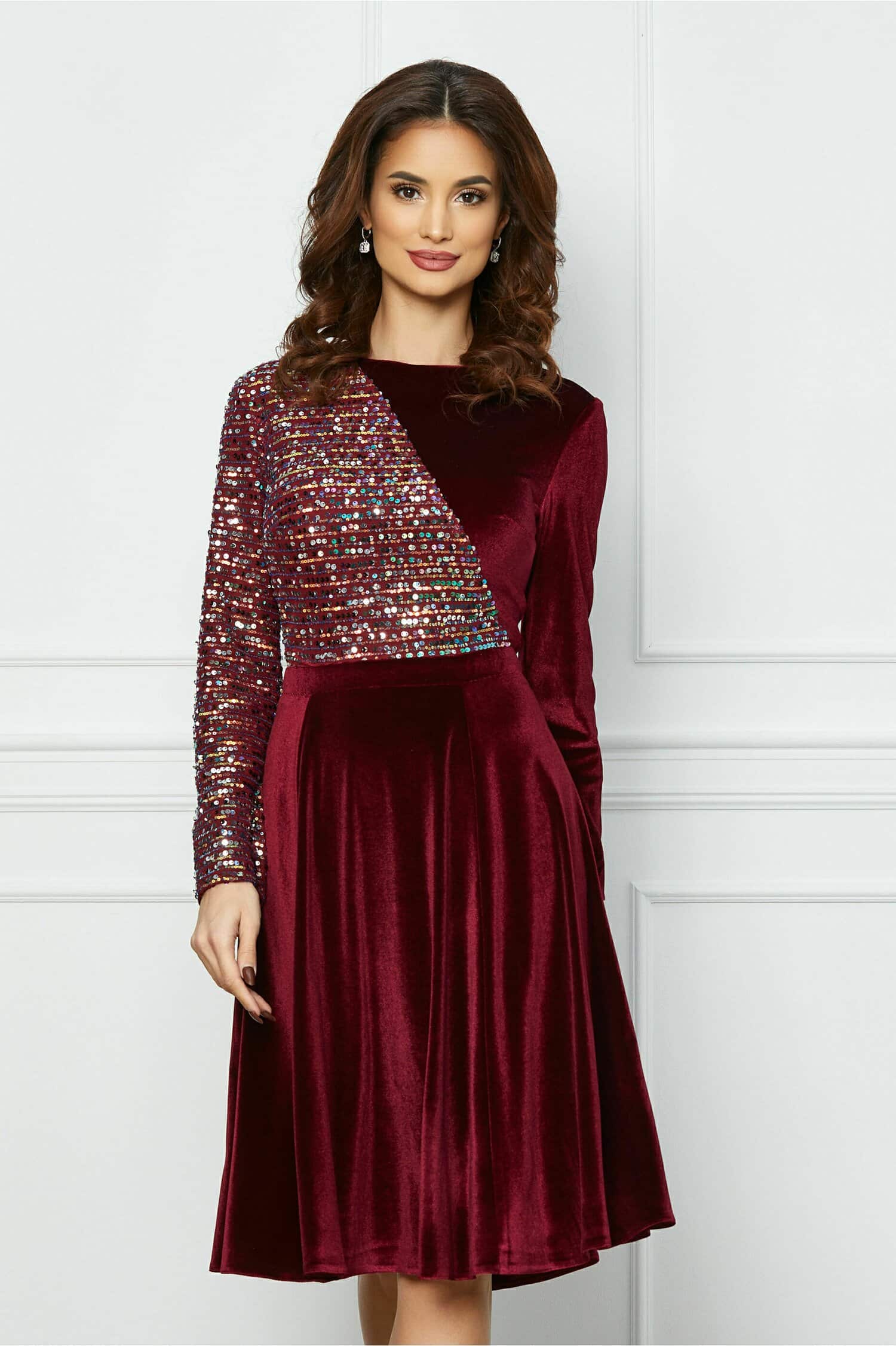 Specification: Rochie Dy Fashion bordo din catifea cu accesorii la umeri