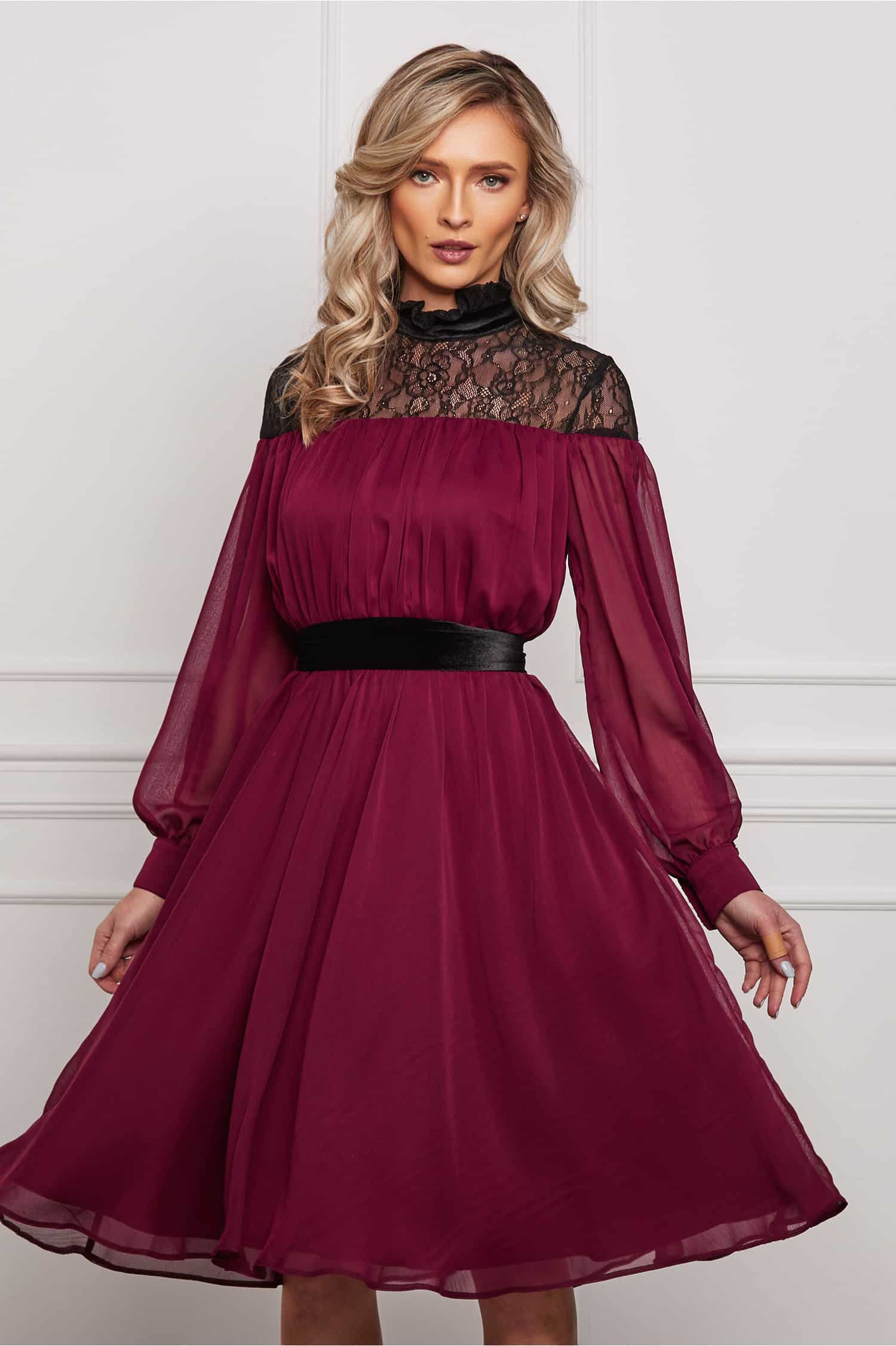 Specification: Rochie Dy Fashion bordo din voal cu cordon catifelat in talie