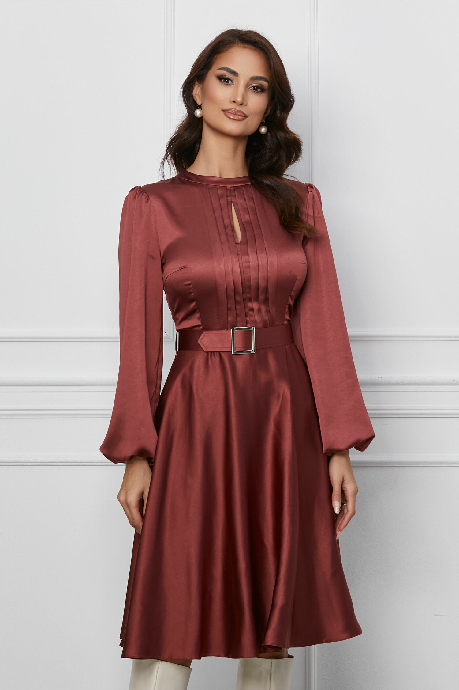 Rochie Dy Fashion caramizie cu pliuri pe bust si curea in talie
