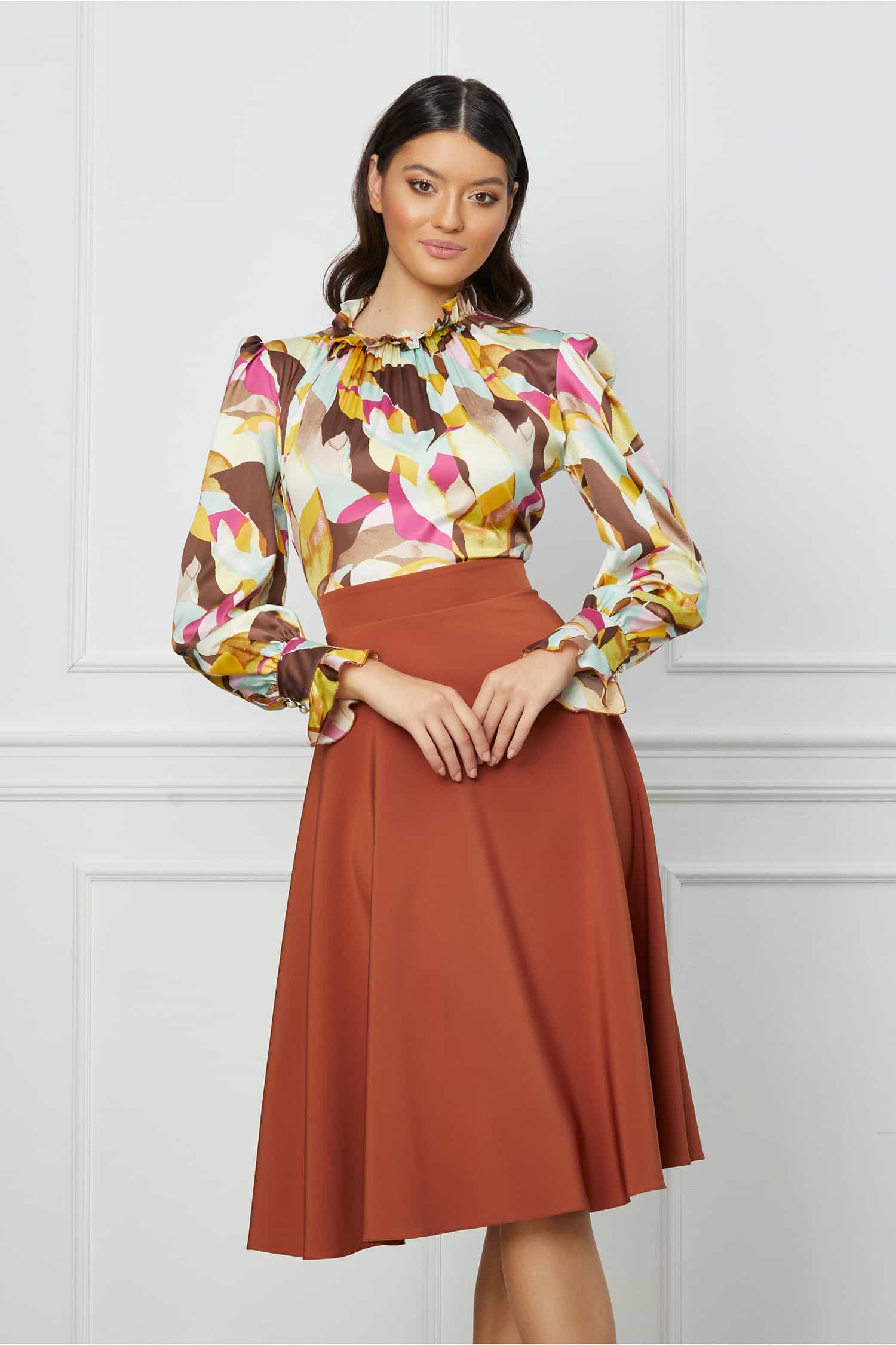 Rochie Dy Fashion clos caramizie cu imprimeu colorat la bust ! Transport si retur gratuite indifernet de valoarea comenzii!
