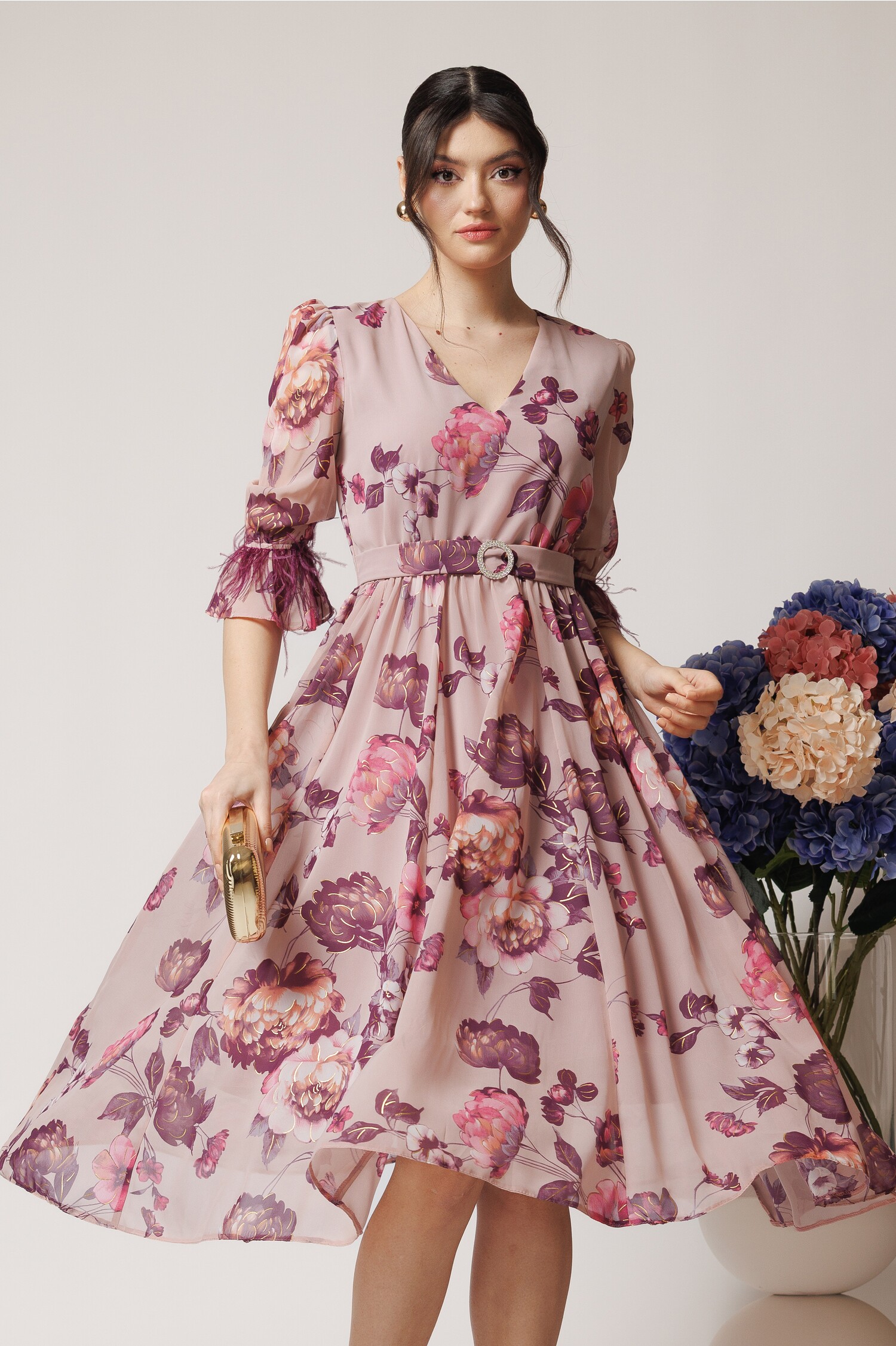 Specification: Rochie DY Fashion eleganta din voal roz cu imprimeuri florale si pene la maneci
