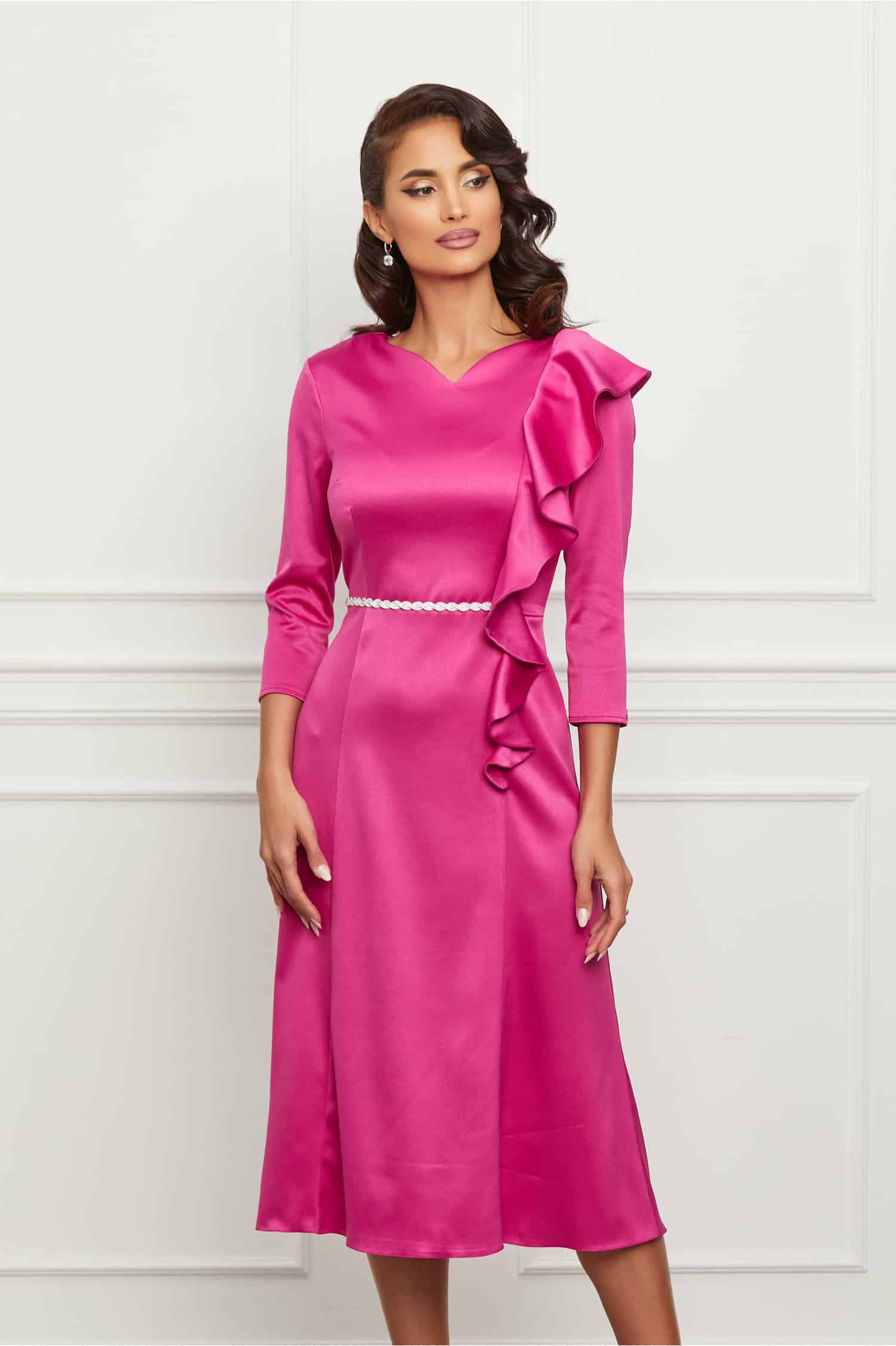 Rochie Dy Fashion fucsia cu volan la bust si accesoriu in talie
