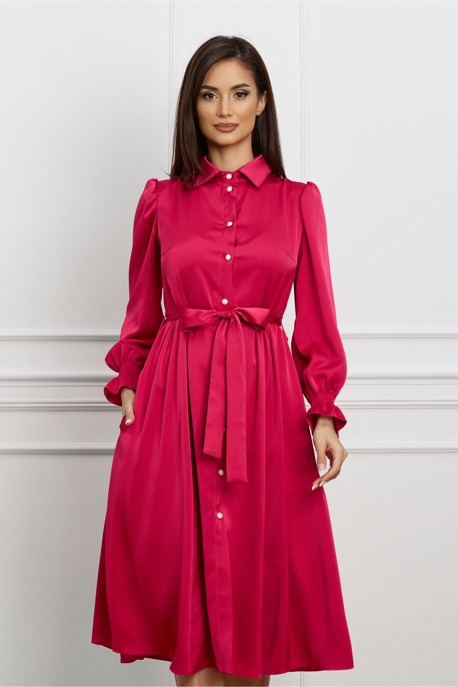 Rochie Dy Fashion fucsia din satin cu nasturi si cordon in talie