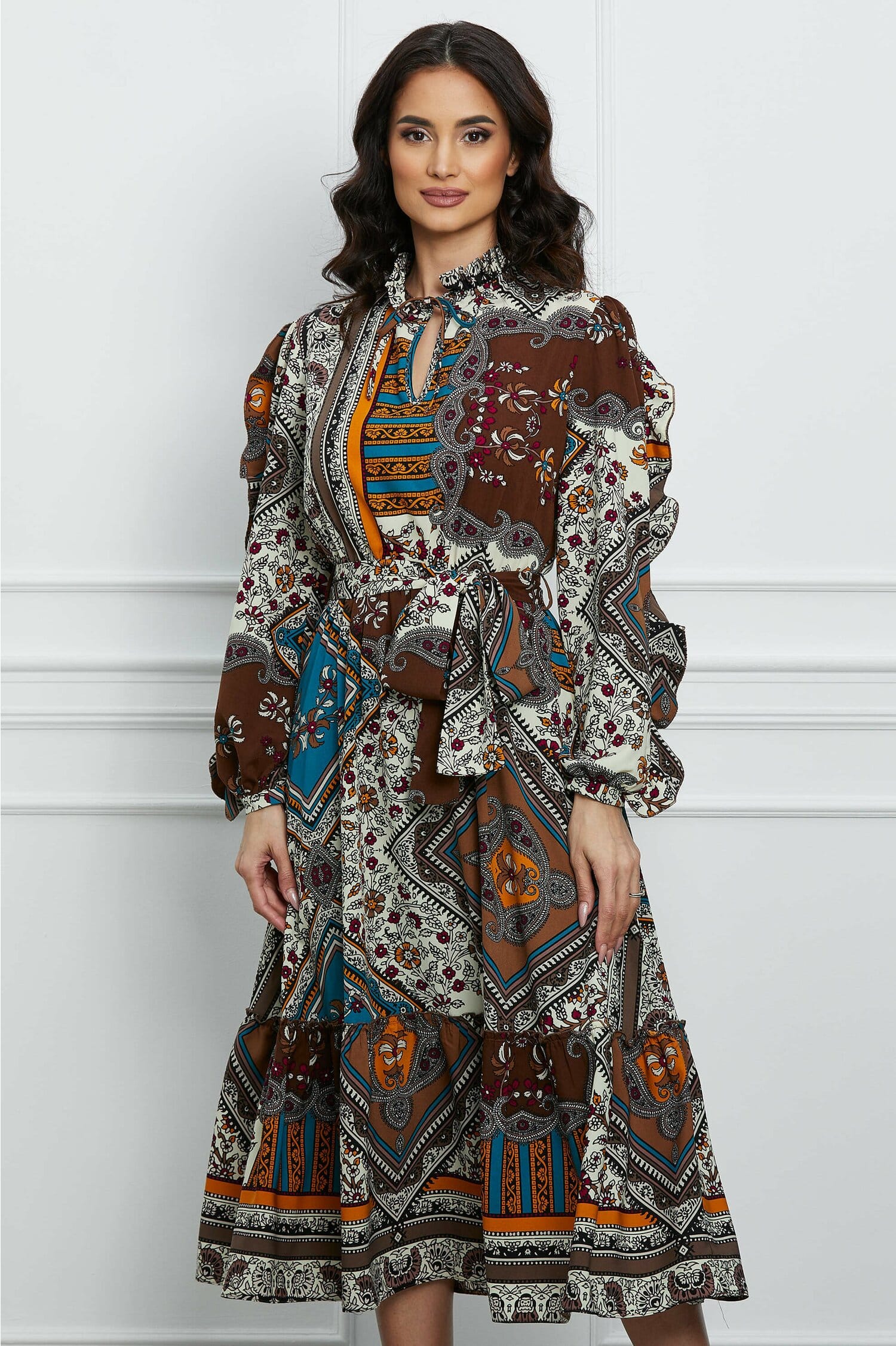 Specification: Rochie Dy Fashion maro cu imprimeuri albe si cordon in talie