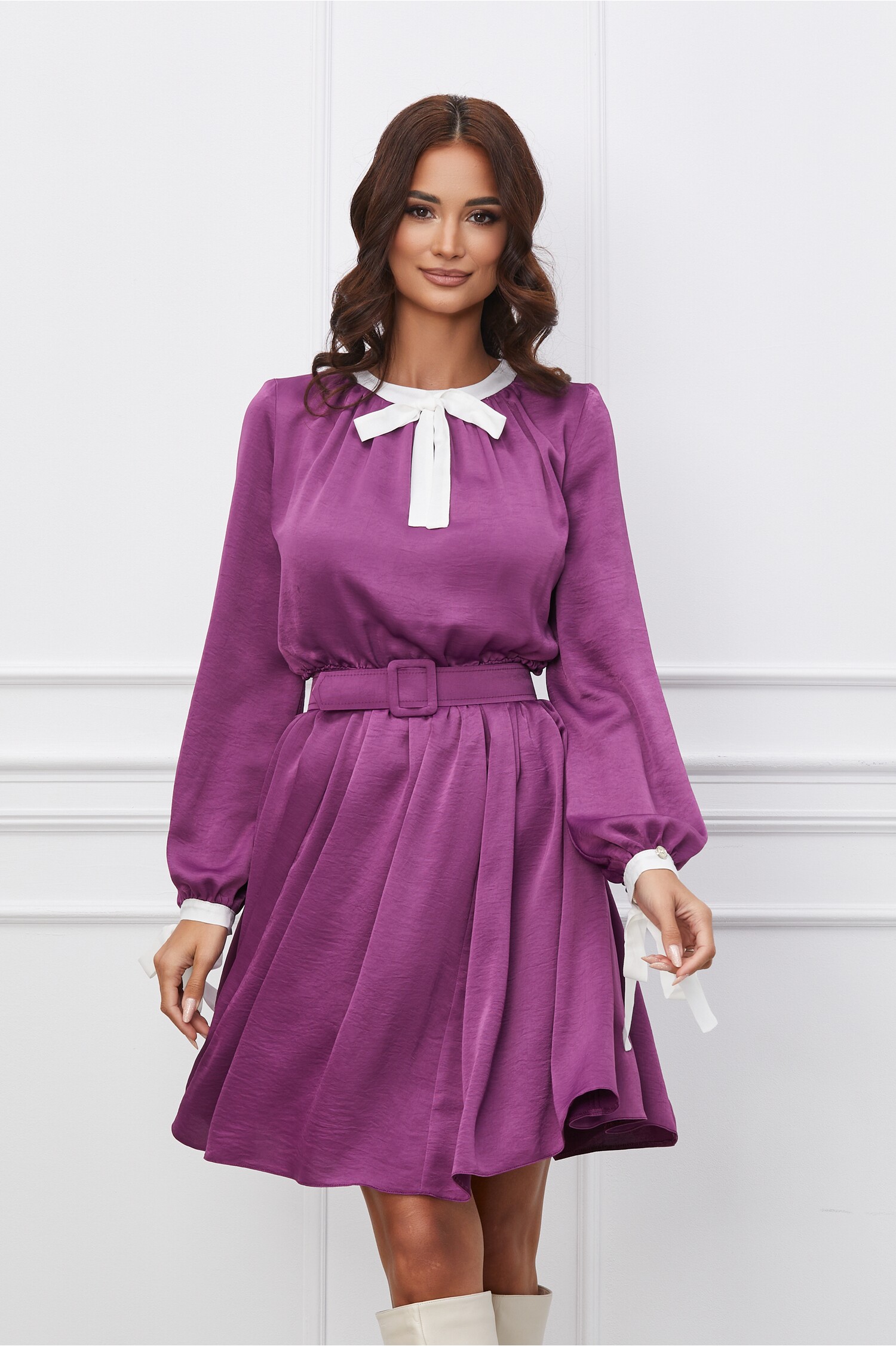 Specification: Rochie Dy Fashion mov cu guler alb si curea in talie