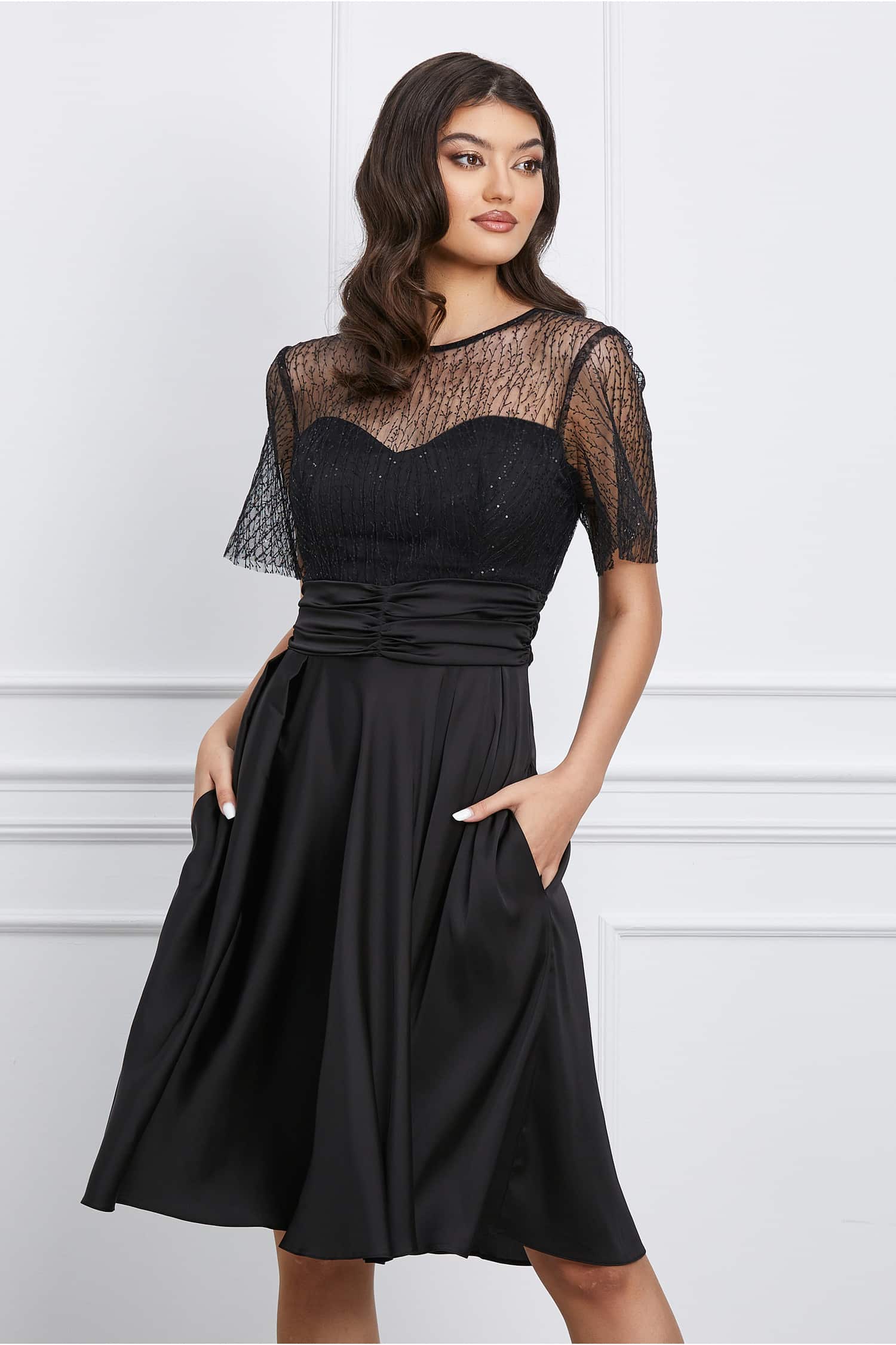 Specification: Rochie Dy Fashion neagra din satin cu broderie la bust