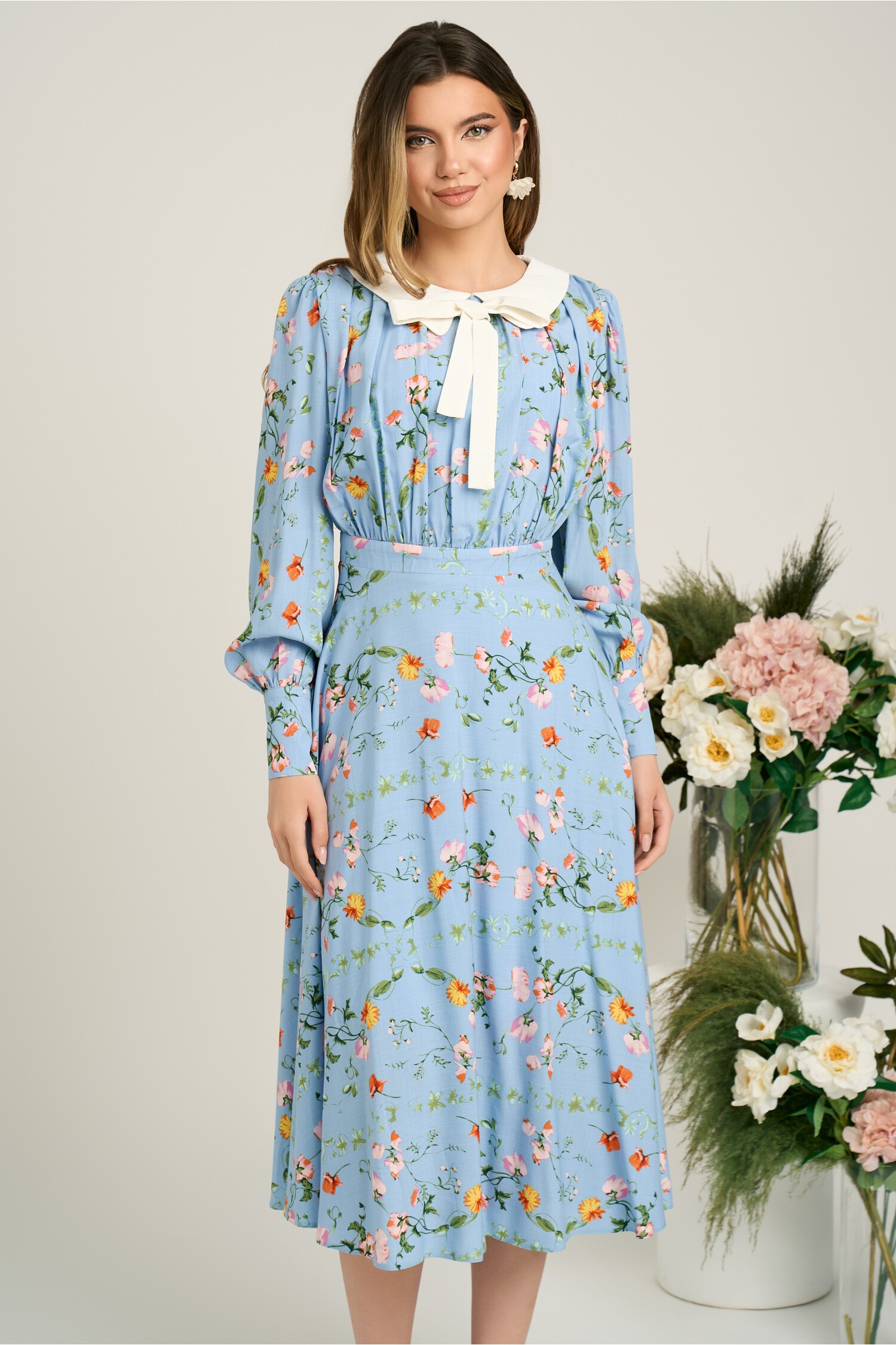 Specification: Rochie DY Fashion office din viscoza bleu cu imprimeuri si funda la decolteu