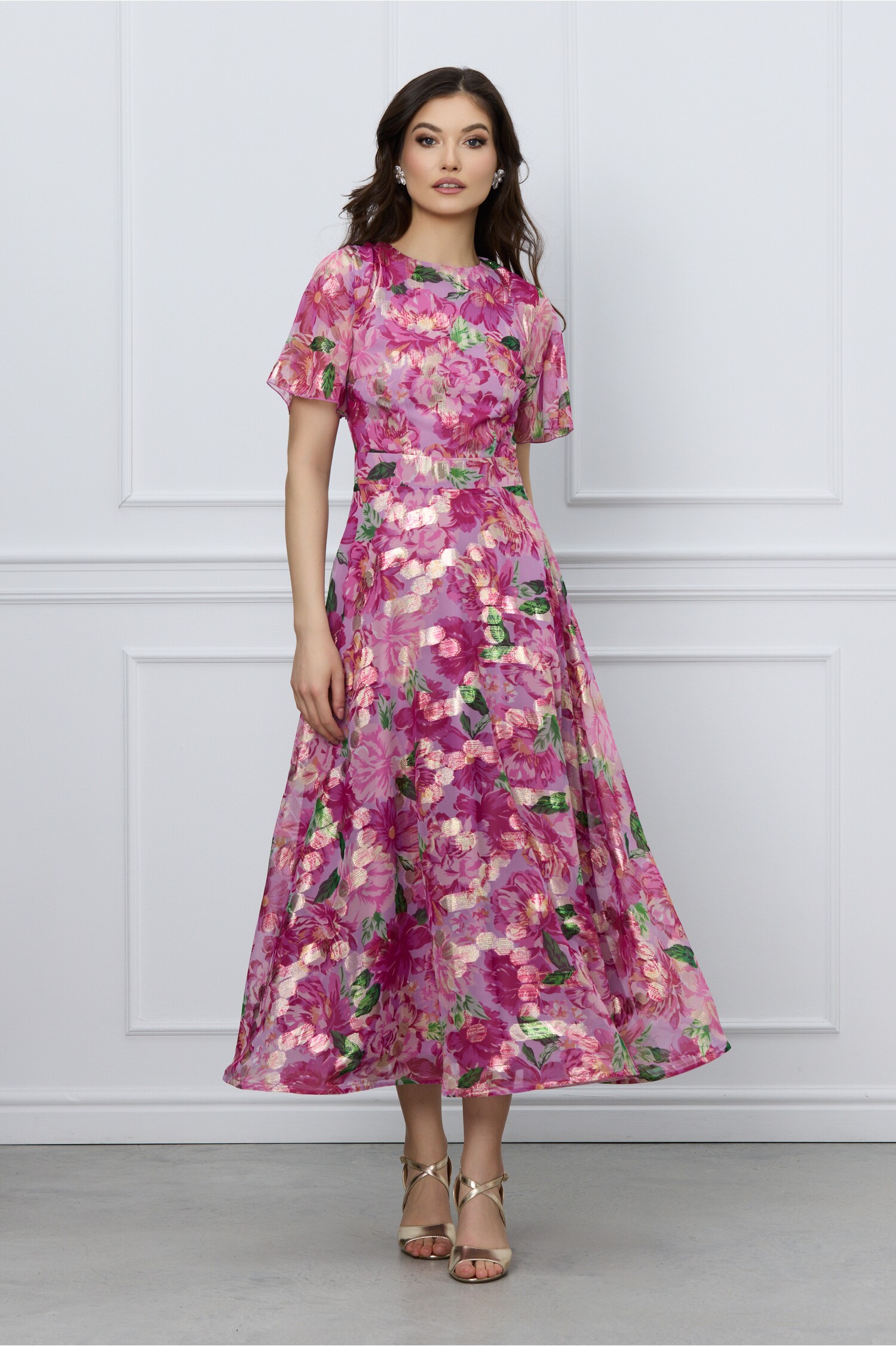 Rochie DY Fashion roz cu imprimeuri florale fucsia si fir lurex