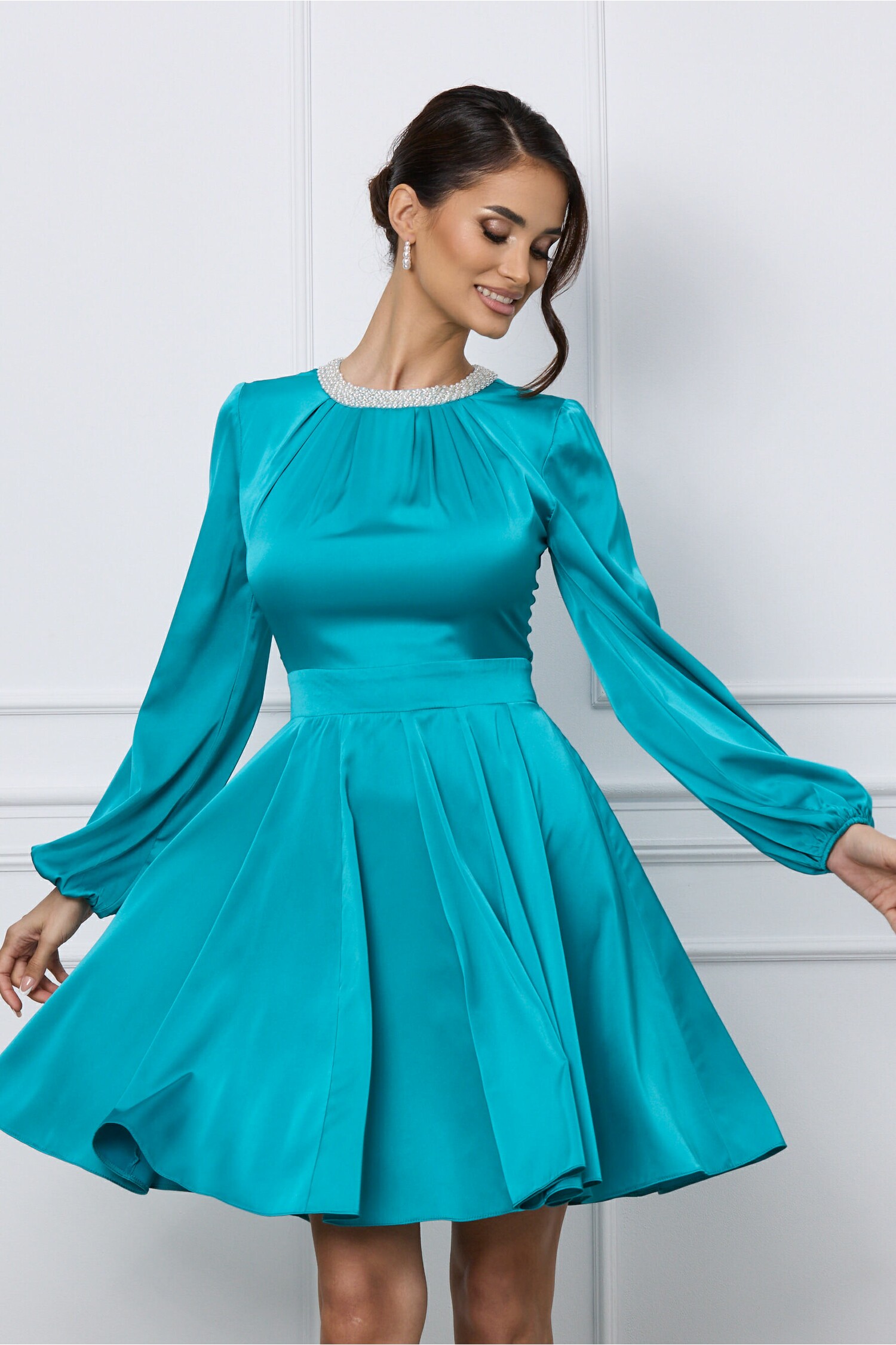 Rochie Dy Fashion turcoaz accesorizata cu perlute la decolteu