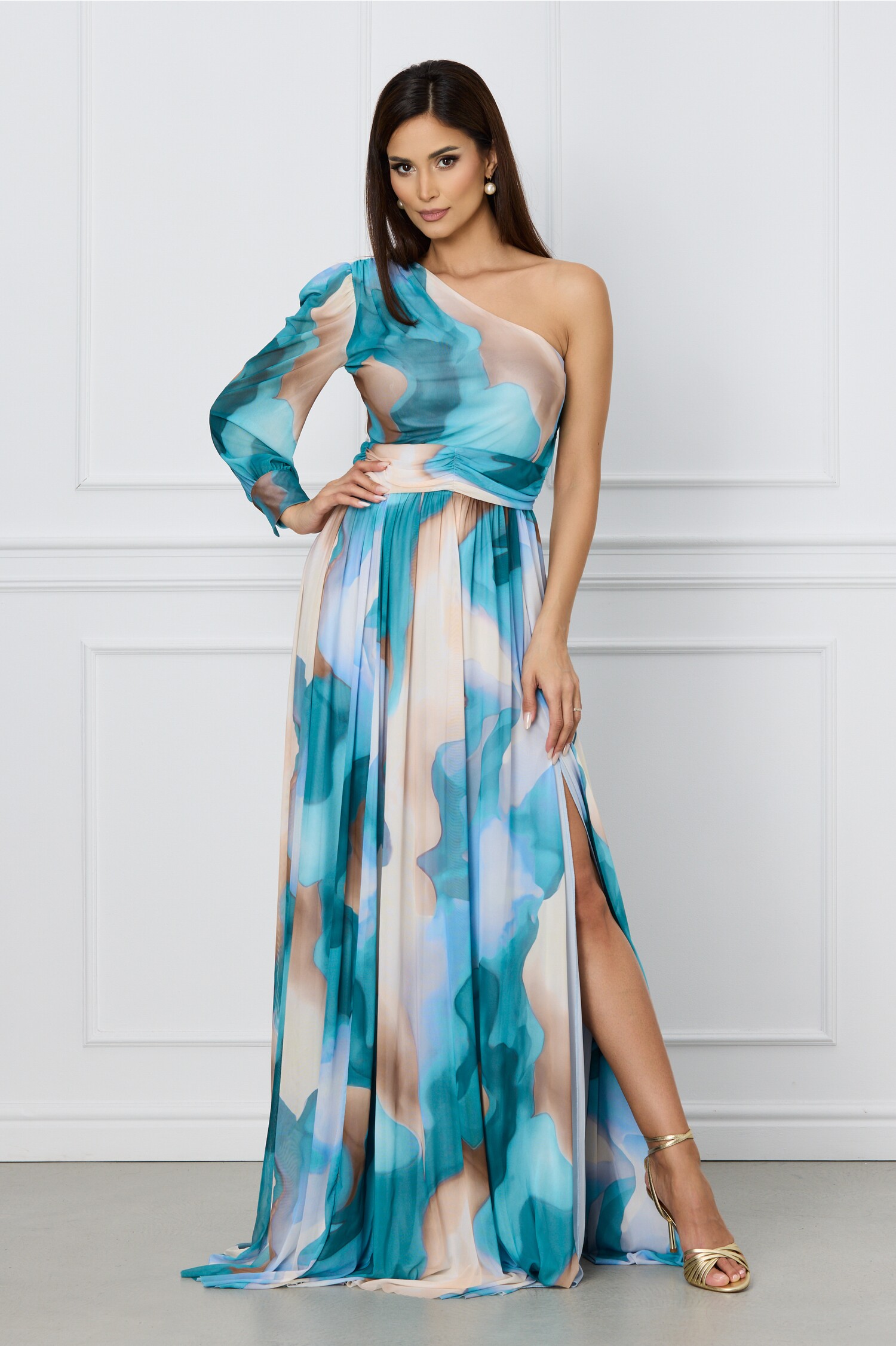 Rochie lunga eleganta cu imprimeuri si un umar gol. Are o maneca lunga, talie marcata, croi clos si crepeu maxi.? Rochie lunga Cu un umar gol O maneca lunga Croi clos Crepeu pe fusta Captusita pe interior Inchidere cu fermoar lateral Material: Tull Compozitie: 96% Poliester, 4% Elastan *Va rugam verificati eticheta produsului inainte de curatare! *Pozitia tiparului imprimeului poate fi diferita datorita taierii. *Va rugam sa retineti ca o usoara discrepanta de culoare ar trebui sa fie acceptabila datorita luminii si luminozitatii ecranului. ? *Va rugam verificati ghidul de marimi, in cm, pentru a alege corect marimea.