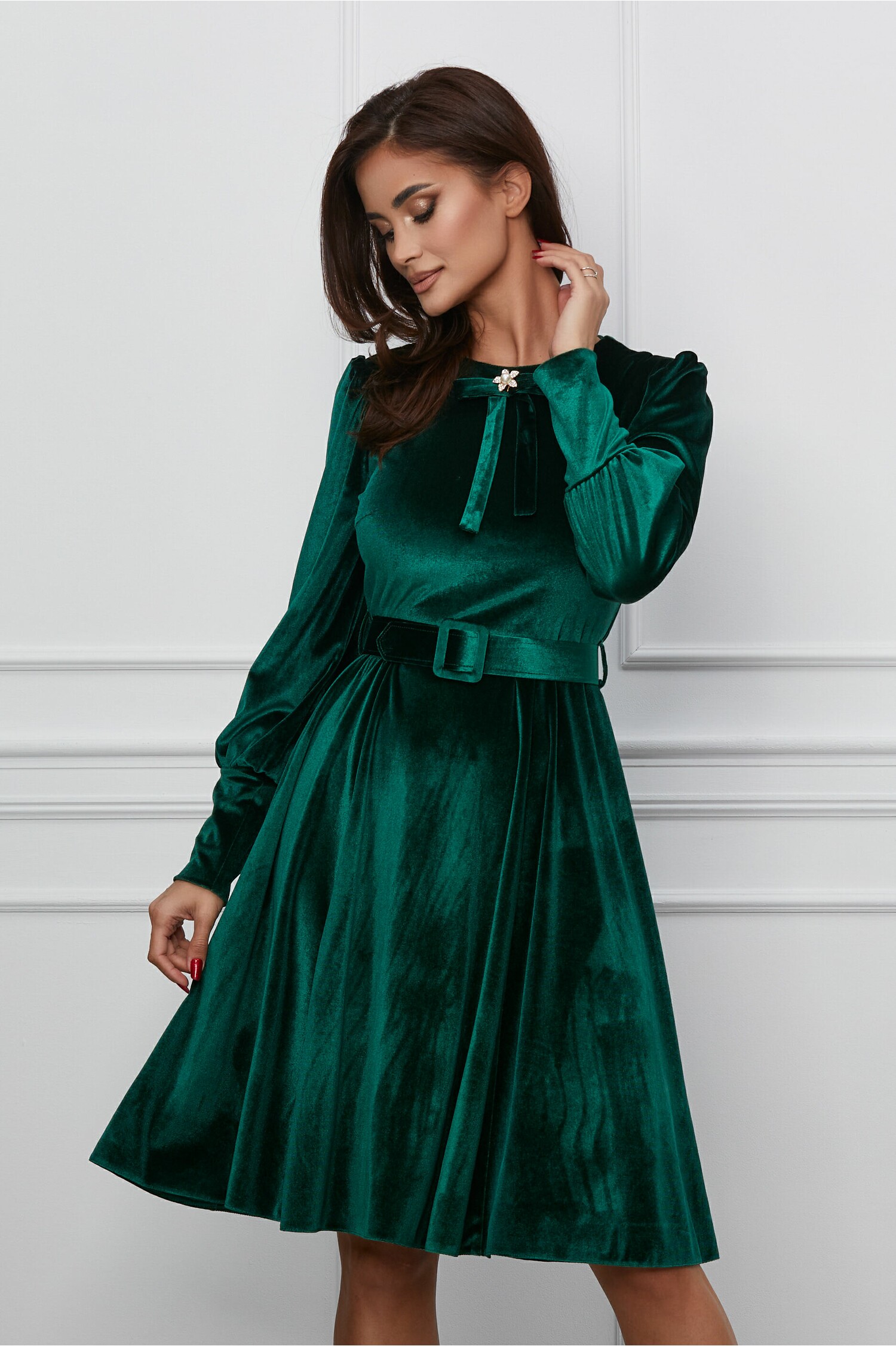 Rochie Dy Fashion verde din catifea cu funda la bust si curea in talie! La acest produs ai transport si retur gratuite!