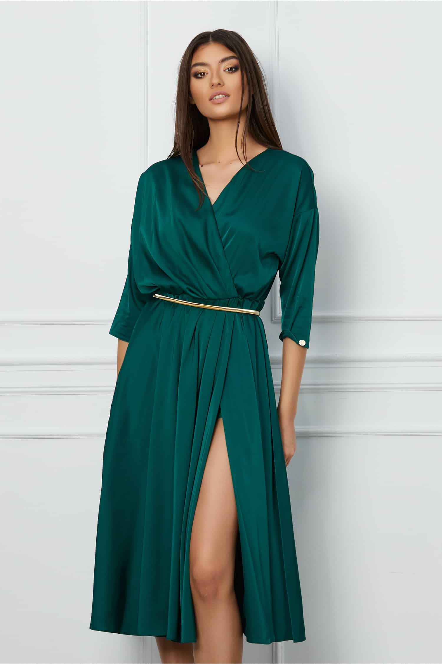 Rochie Dy Fashion verde din satin cu elastic si curea in talie ! Transport si retur gratuite indifernet de valoarea comenzii!