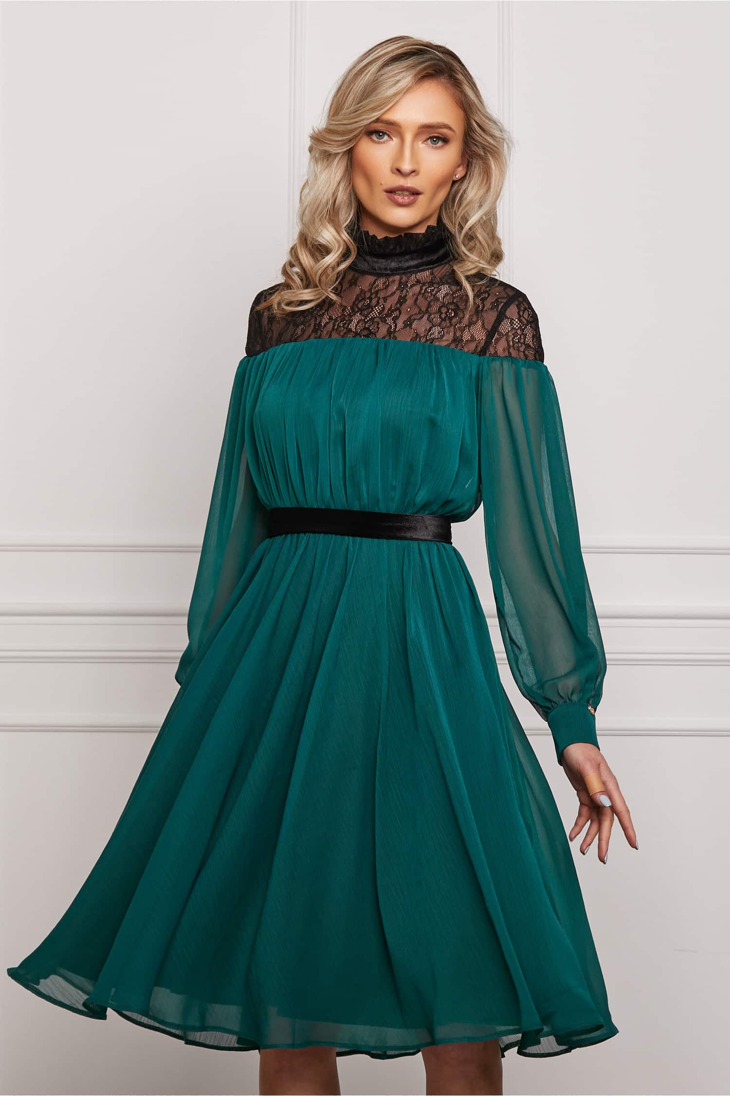 Specification: Rochie Dy Fashion verde petrol din voal cu cordon catifelat in talie