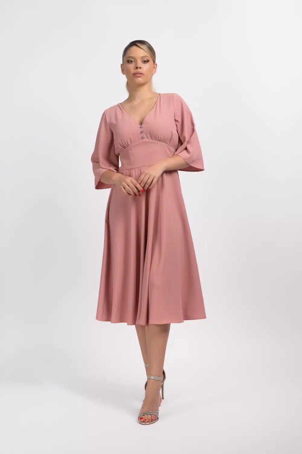 Rochie de ocazie roz prafuit fluida confectionata din dublu-voal cu lungimea midi si croiala in clos care avantajeaza orice tip de silueta prezinta maneca scurta lejera bust din voal dublat. Accesorizata in zona taliei cu trei nasturi tip bijuterie decolteu in V. Se inchide la spate cu fermoar si prezinta talie elastica.Intretinere:Respectati instructiunile de curatare de pe eticheta produsului.Info model:Inaltime 170 cm poarta marimea S.Produs fabricat in Romania.