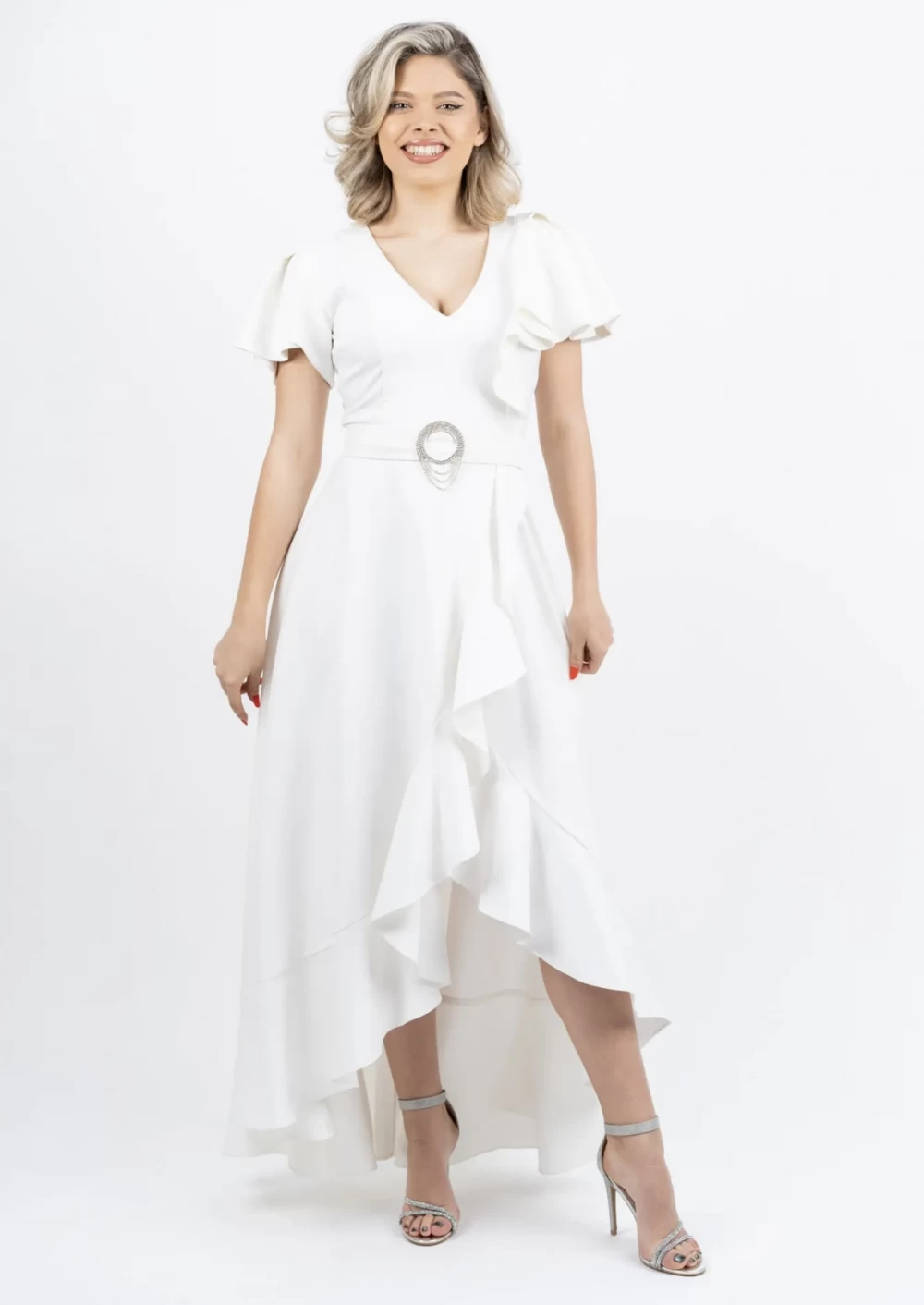 Rochie eleganta alba croita in clos fusta cu aspect petrecut usor asimetrica confectionata din material fluid vaporos cu talia marcata cu o centura detasabila decolteu in V si maneca scurta tip fluture. Prezinta volane si slit lateral se inchide cu fermoar la spate. Deosebita si diafana iti va oferi un look spectaculos la cele mai selecte evenimente.Caracteristicirochie vaporoasacroiala clos lungime midifermoar la spateprodus romanescIntretinereRespectati instructiunile de curatare de pe eticheta produsului.Info model: poarta marimea S inaltime 170 cm.Compozitie: 88% poliester 12% spandex.