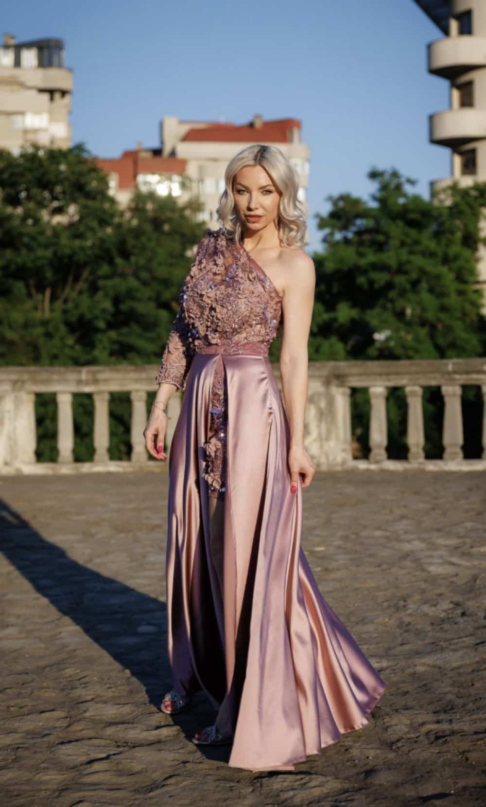 Rochie lunga eleganta vaporoasa confectionata din tafta roz prafuit cu partea superioara din broderie 3D cu o maneca transparenta din tulle fin cu aplicatie de broderie si bust buretat cupe push-up. Partea superioara continua in jos sub forma de fusta mini astupata de fusta de voal are descopera usor din aceasta prin crapatura din lateral pe care o are. Pretioasa si misterioasa rochia din tafta este tinuta perfecta pentru a te face remarcata si adrmirata la evenimentele la care iti vei face aparitia.Caracteristicitafta si broderie 3Dcupe push-upfermoar o maneca transparentacrapatura pe piciorProdus romanescIntretinereRespectati instructiunile de curatare de pe eticheta produsuluiInfo model- inaltime 170 cm poarta marimea S.