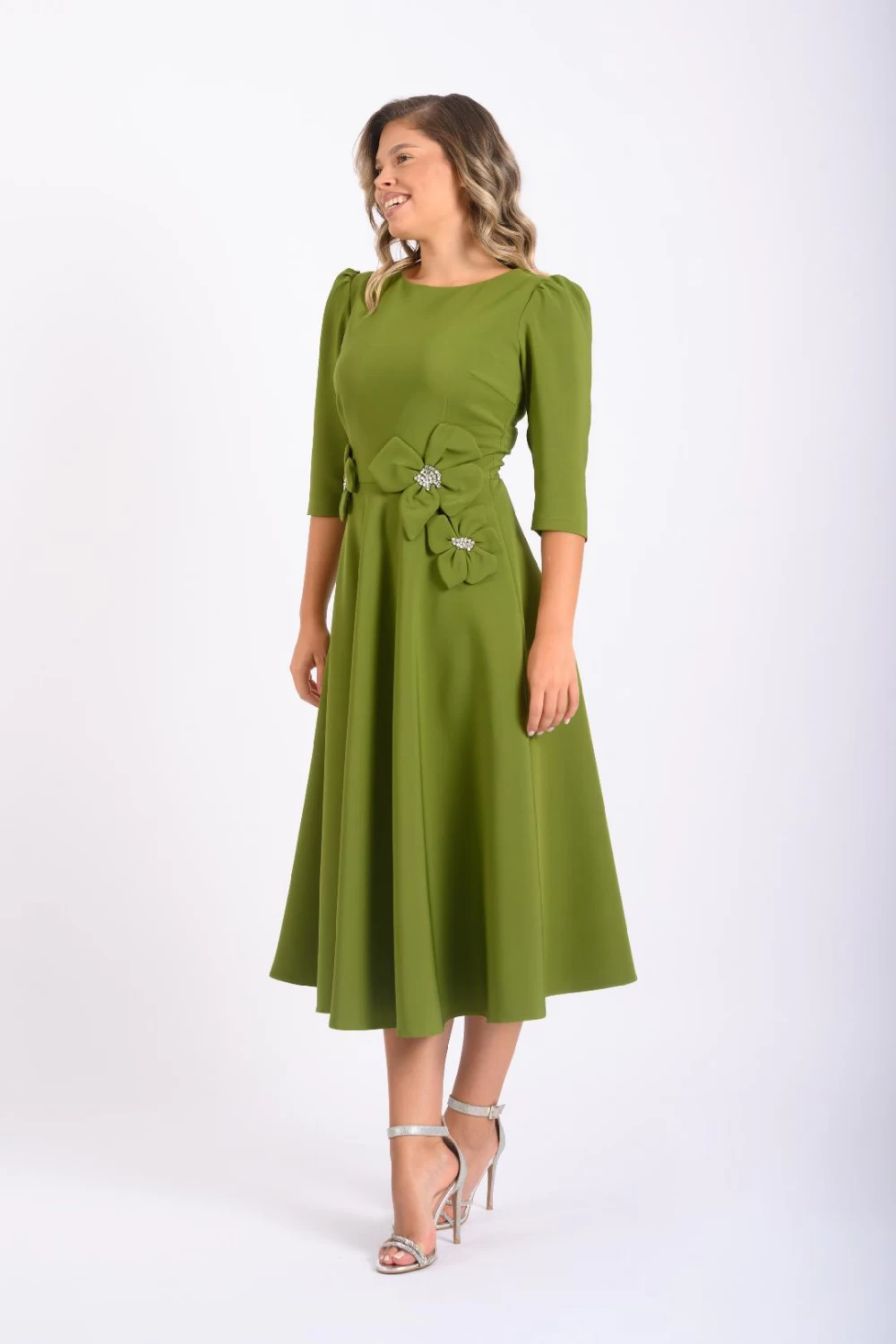 Rochie eleganta de culoare fistic cu lungima midi confectionata din tesatura de calitate croiata in clos care avantajeaza orice tip de silueta cu maneca trei sferturi si detalii la talie. Se inchide cu fermoar la spate si prezinta buzunare laterale.Intretinere:Respectati instructiunile de curatare de pe eticheta produsului.Info model:Inaltime 170 cm poarta marimea S.Produs fabricat in Romania.Compozitie: 12%Sapandex 88%Poliester