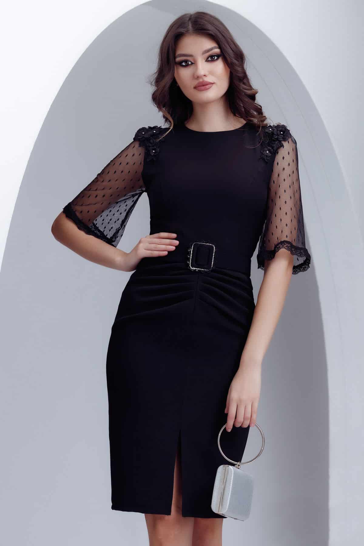 Rochie eleganta Fofy neagra cu maneci de dantela si aplicatii 3D