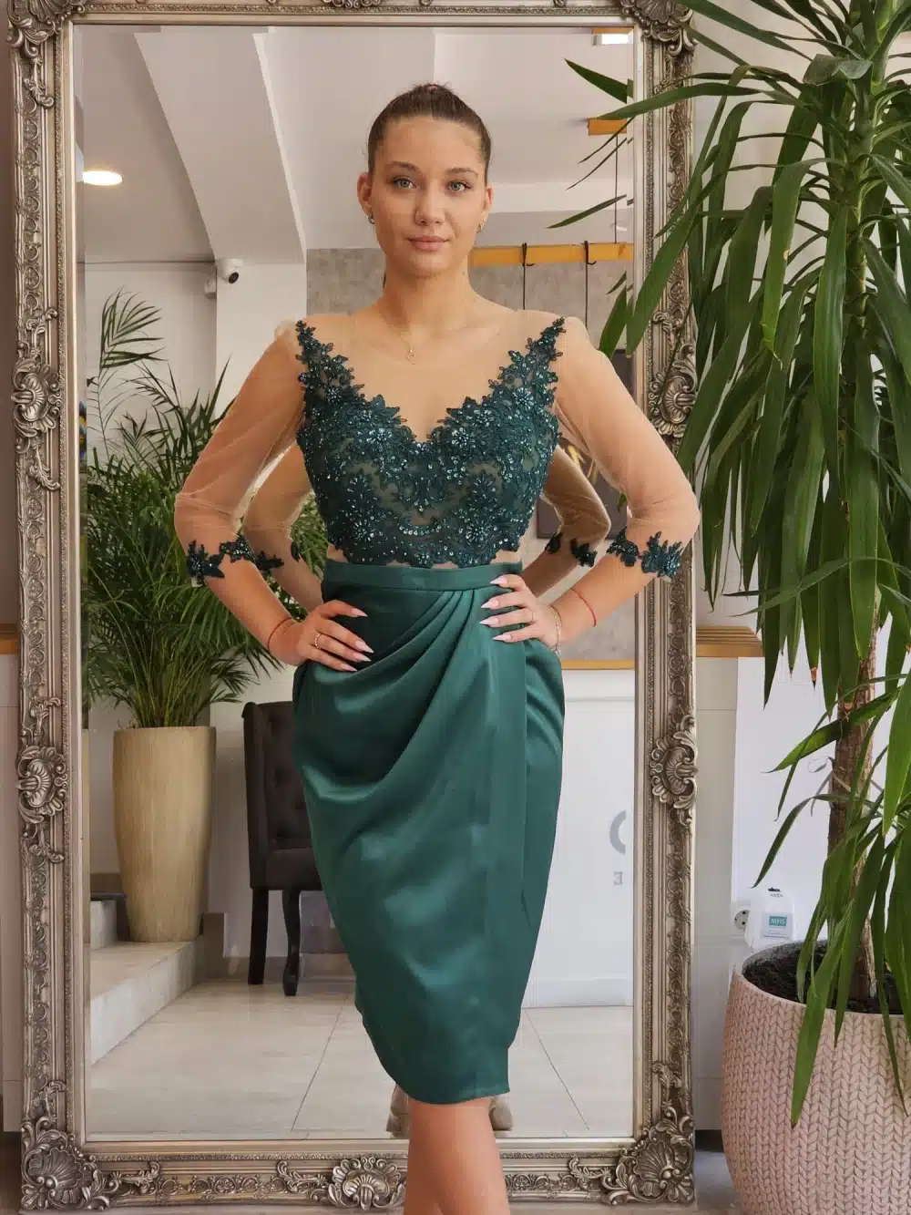 Rochie de ocazie din tafta verde cu aspect petrecut conica de lungime medie.Partea superioara lucrata din broderie pretioasa cu perle si pietre bust buretat si fermoar la spate. Maneca lunga din tull cu aplicatie din broderieIntaritura la talie Caracteristicirochie eleganta de ocazie din tafta verdepartea superioara din broderie si cupe cu push-upinchidere cu fermoar la spateIntretinereRespectati instructiunile de curatare de pe eticheta produsului.Produs fabricat in RomaniaInfo model:Inaltime 170cm poarta marimea S.