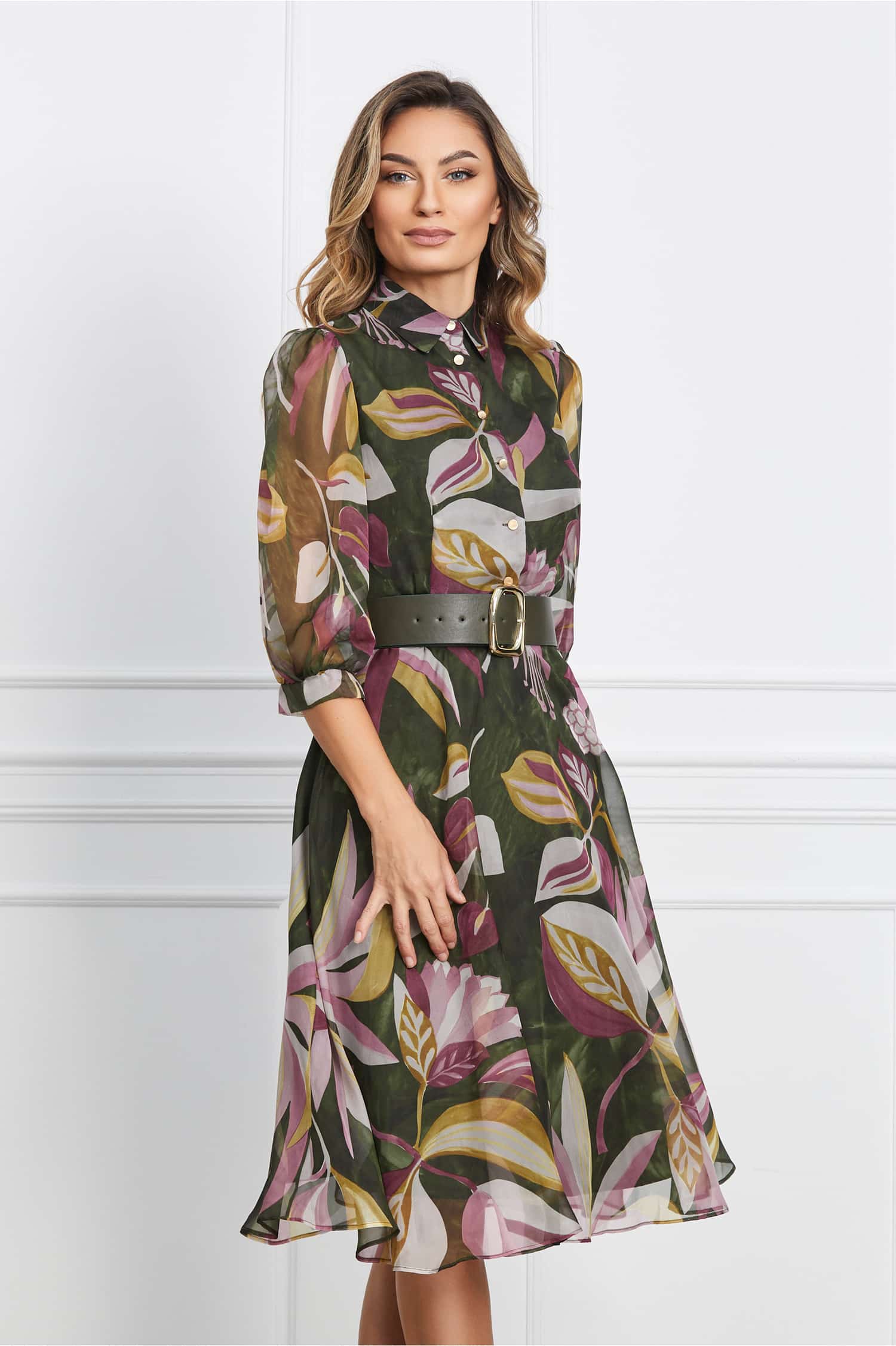Specification: Rochie Elena kaki cu imprimeuri florale lila si nasturi la bust