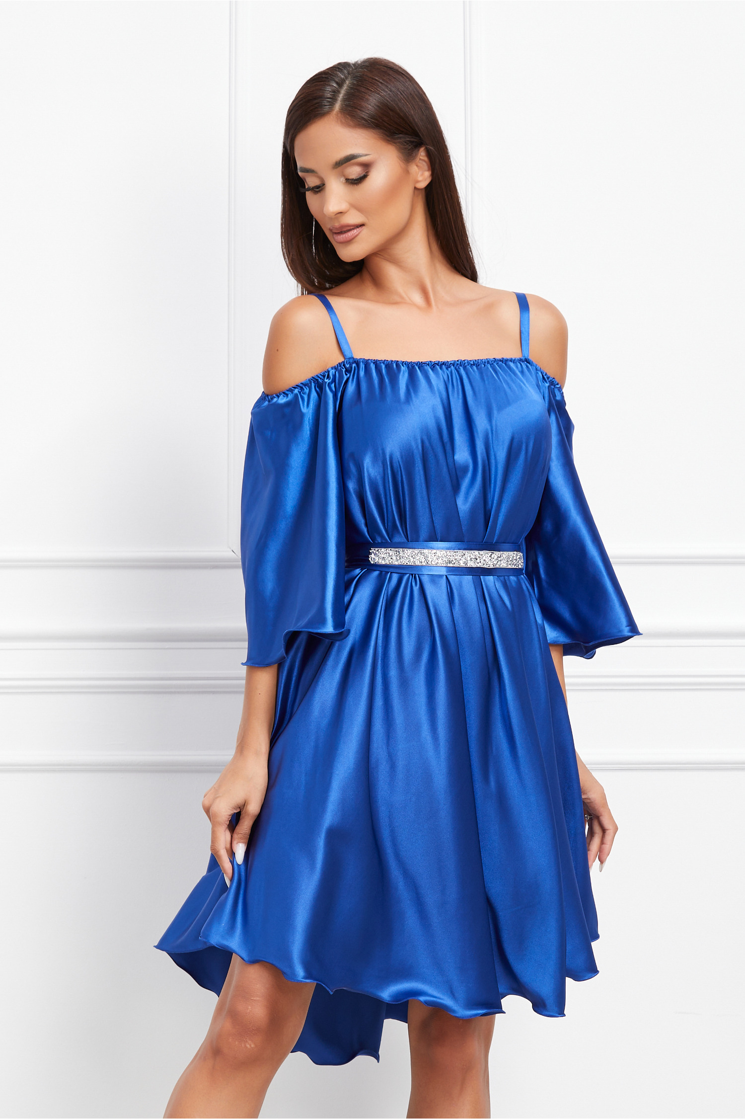 Rochie Ella Collection Amedeea albastru inchis accesorizata cu un cordon cu strasuri in talie! La acest produs ai transport si retur gratuite!