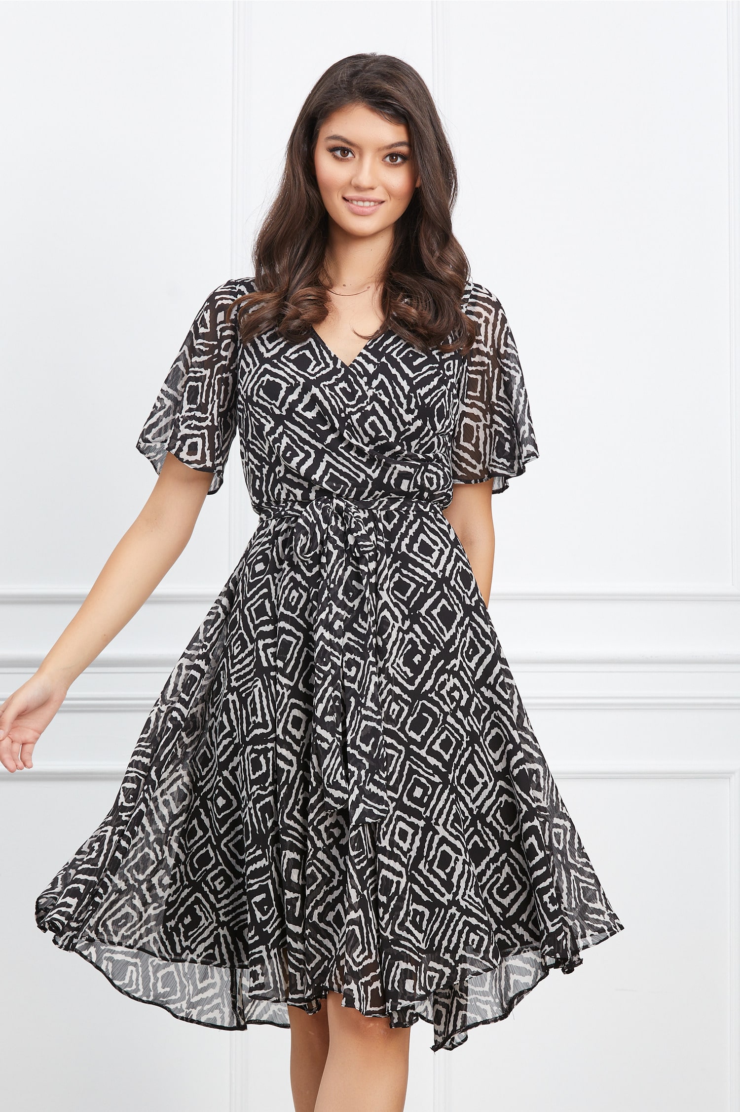 Rochie Ella Collection Amy din voal neagra cu imprimeu alb si cordon in talie ! Transport si retur gratuite indifernet de valoarea comenzii!