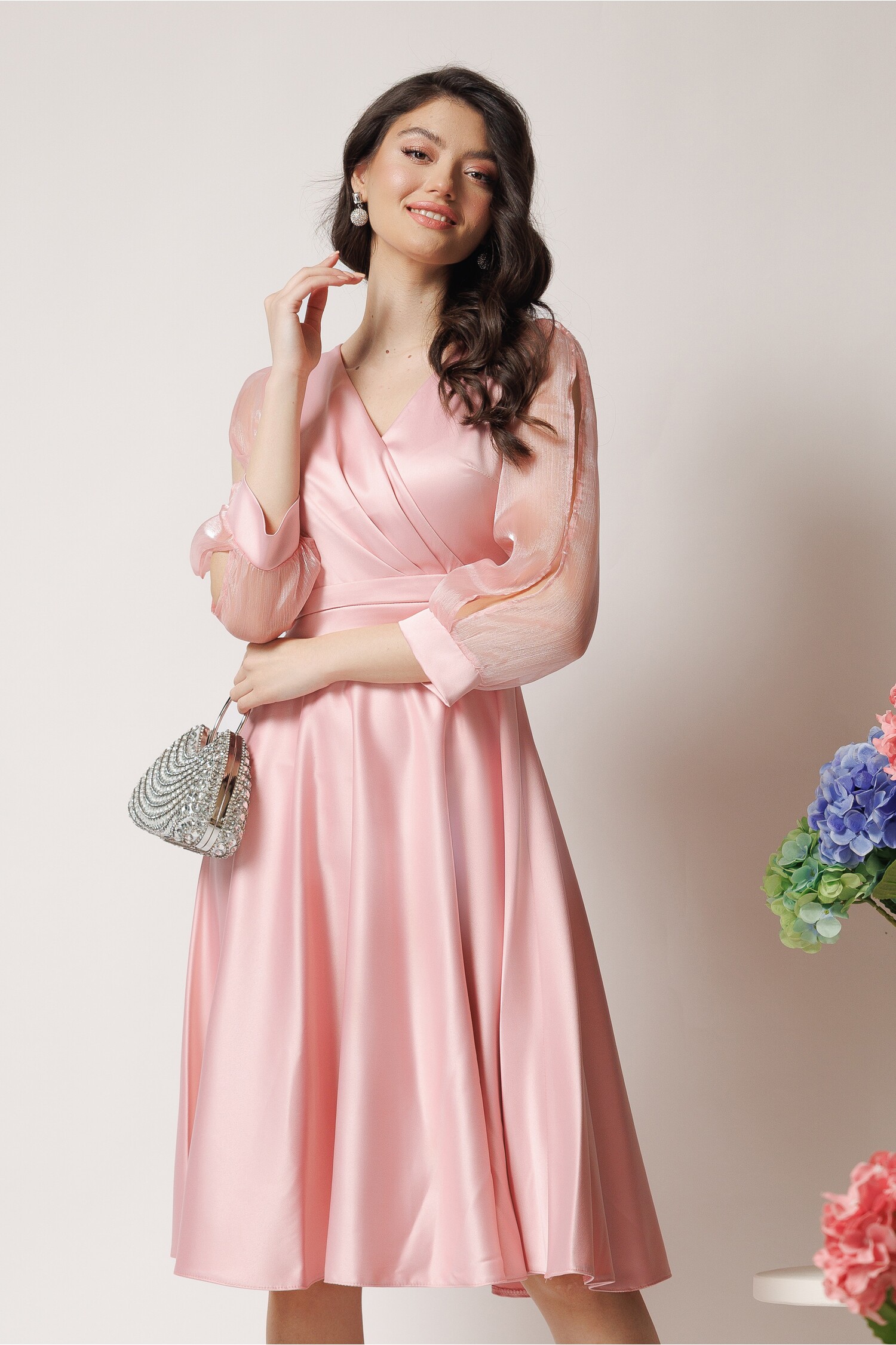 Specification: Rochie Ella Collection Anda eleganta din tafta roz cu maneci din organza