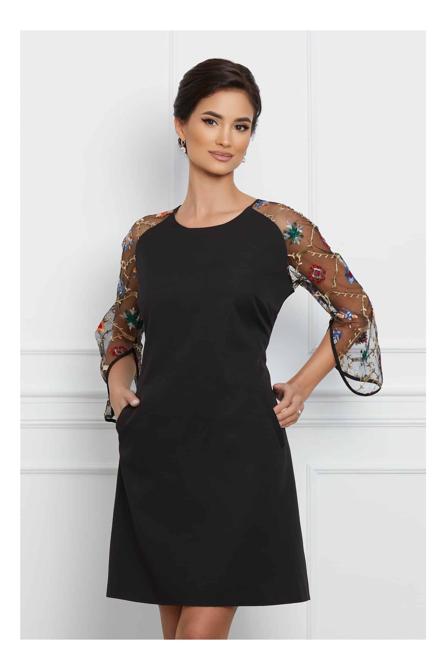 Rochie Ella Collection Andrea neagra cu borderie bej pe maneci si buzunare functionale