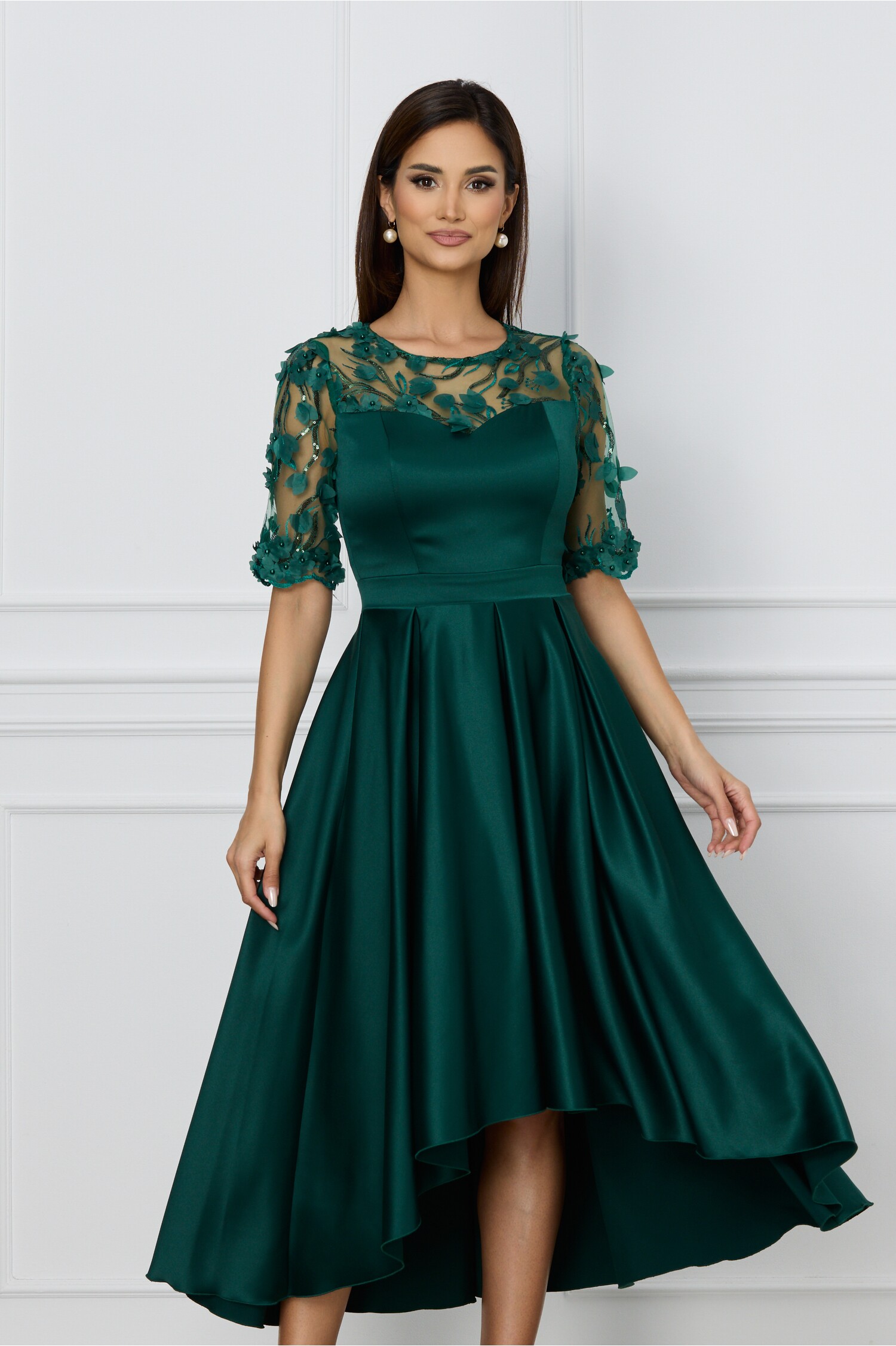 Specification: Rochie Ella Collection Brinda verde inchis din tafta cu lungime asimetrica