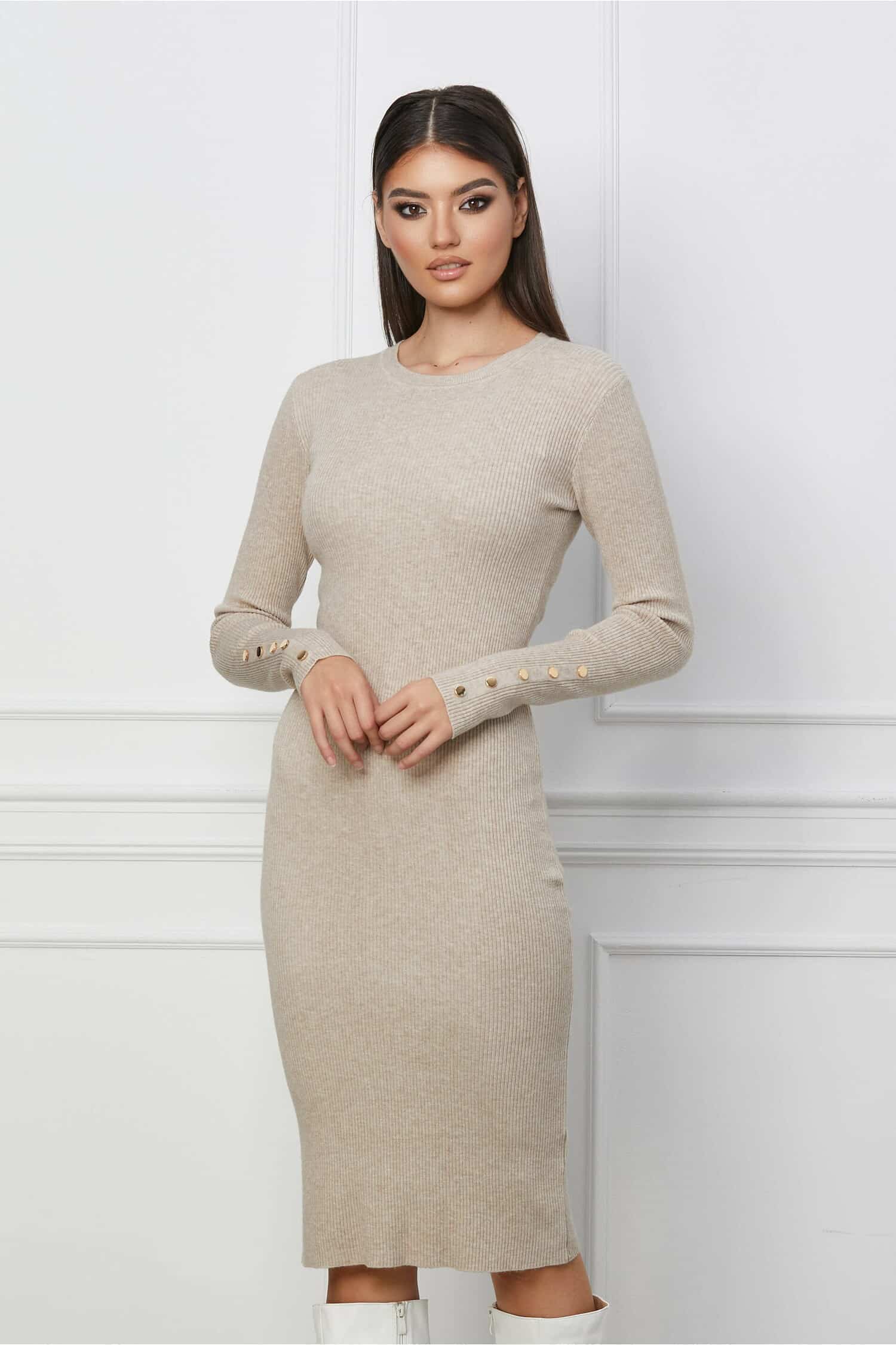 Specification: Rochie Ema bej din tricot reiat cu nasturi la baza manecilor