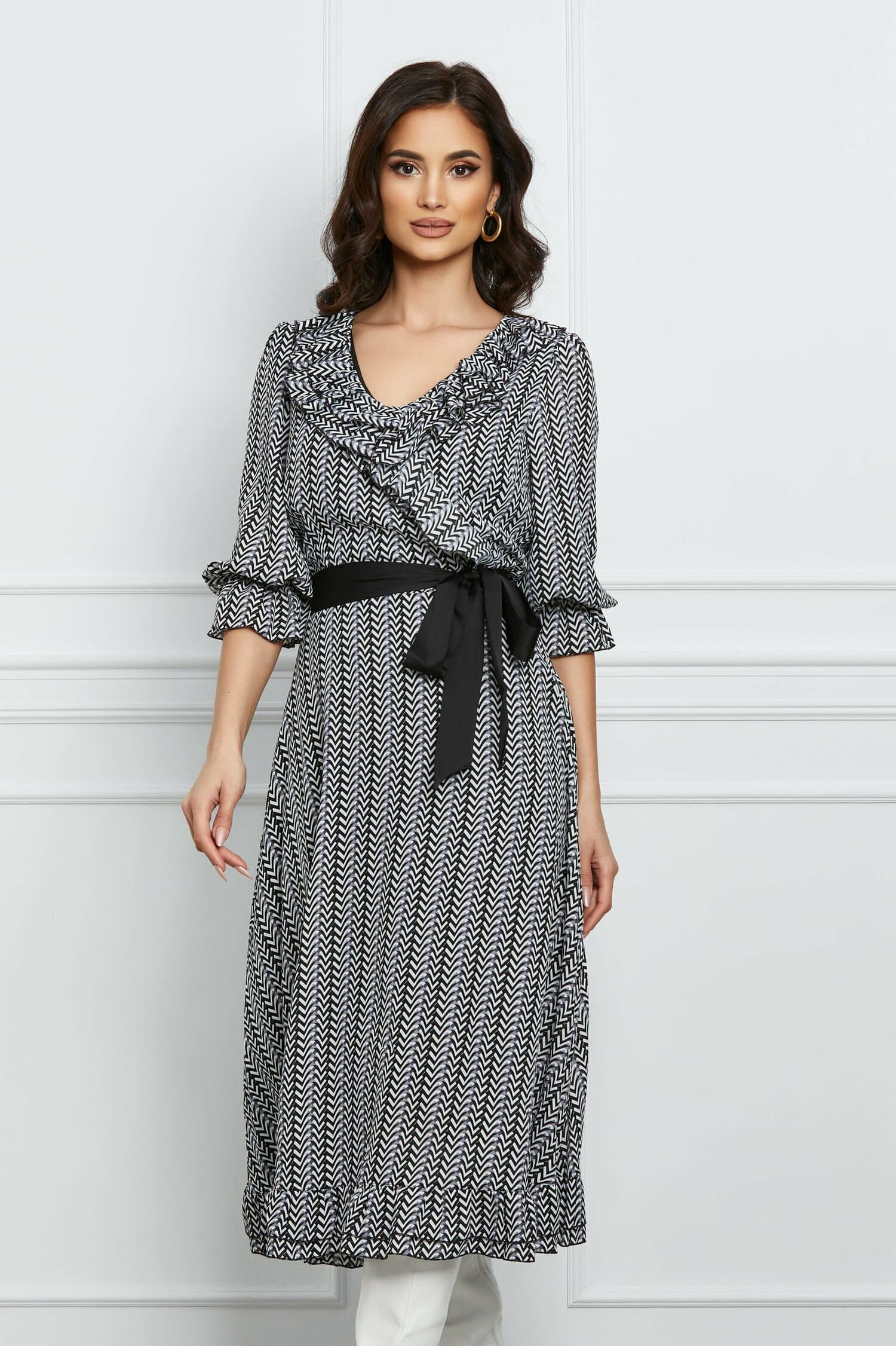 Specification: Rochie Felicia gri cu imprimeu alb-negru si cordon in talie