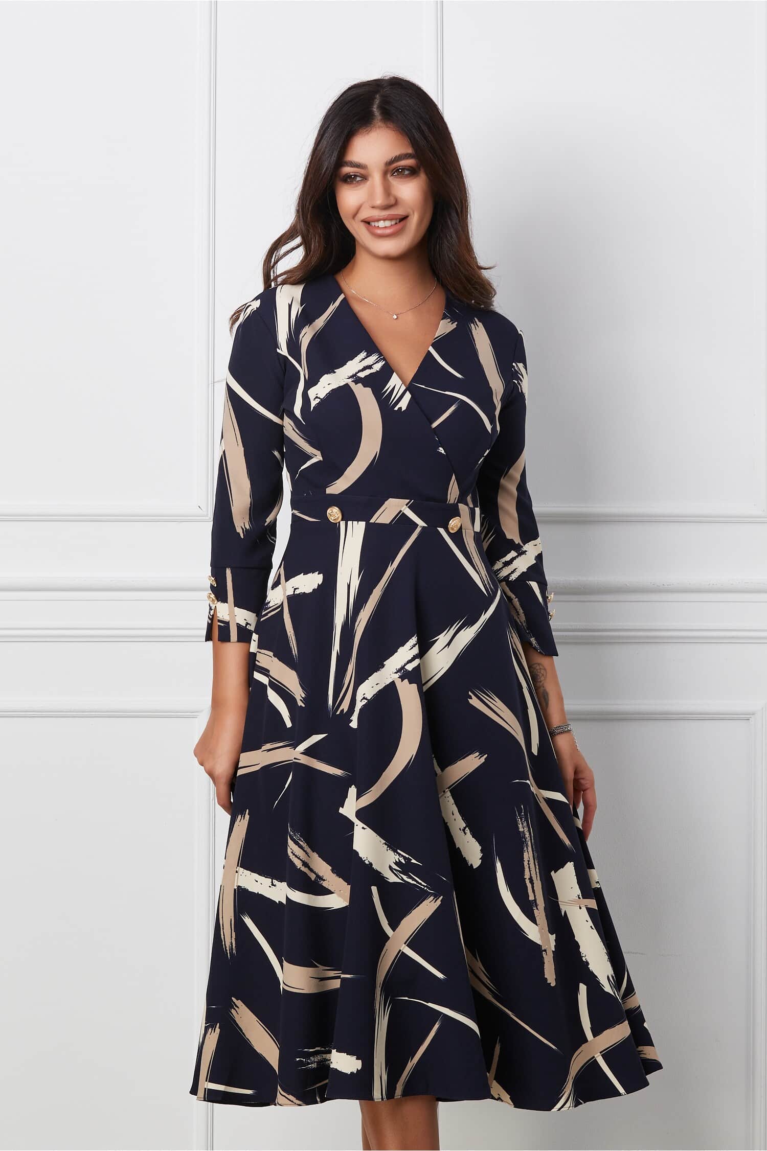 Rochie Ilona bleumarin cu imprimeuri bej si nasturi in talie