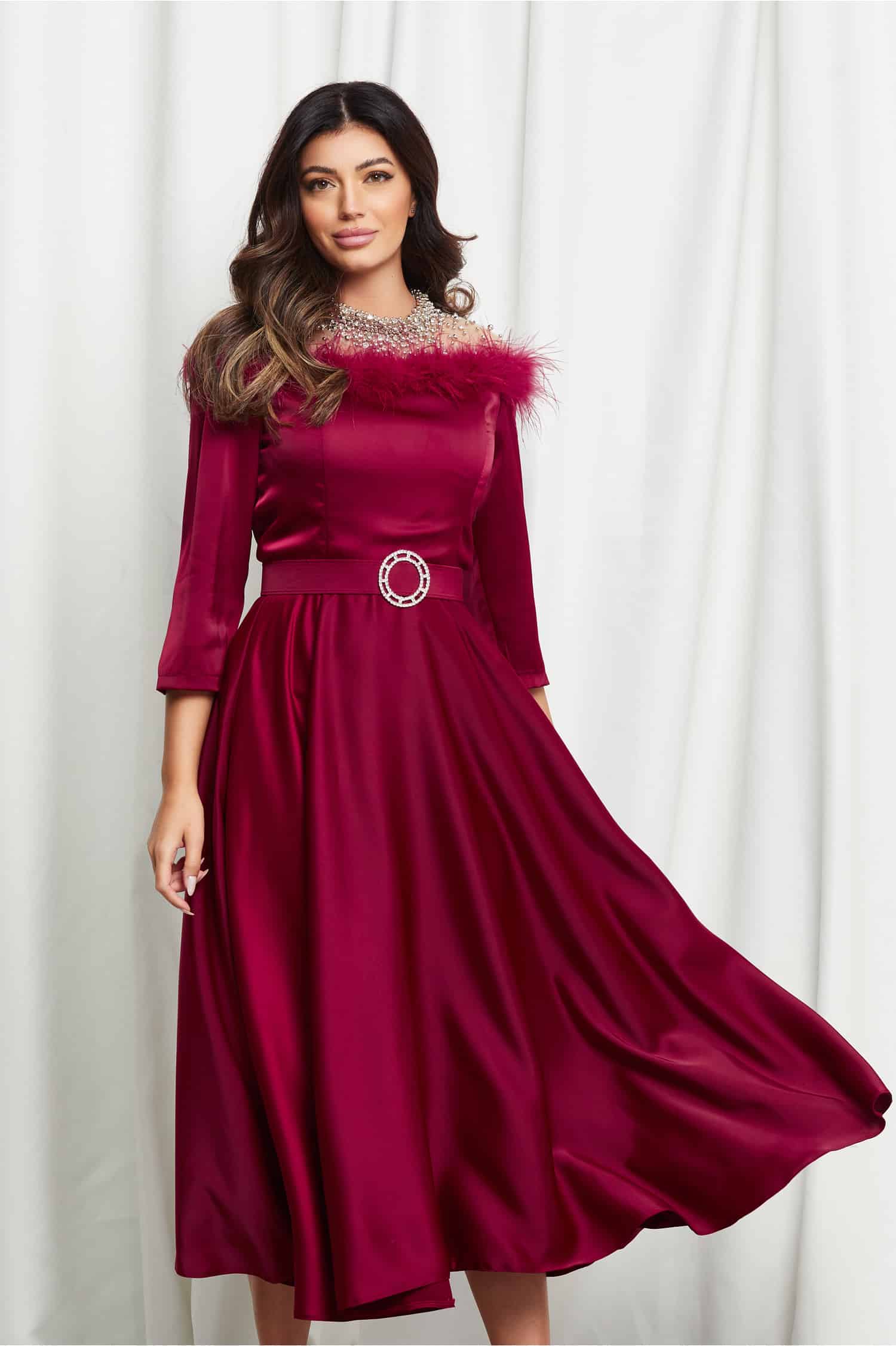 Specification: Rochie Ingrid bordo cu fulgi la bust si curea in talie