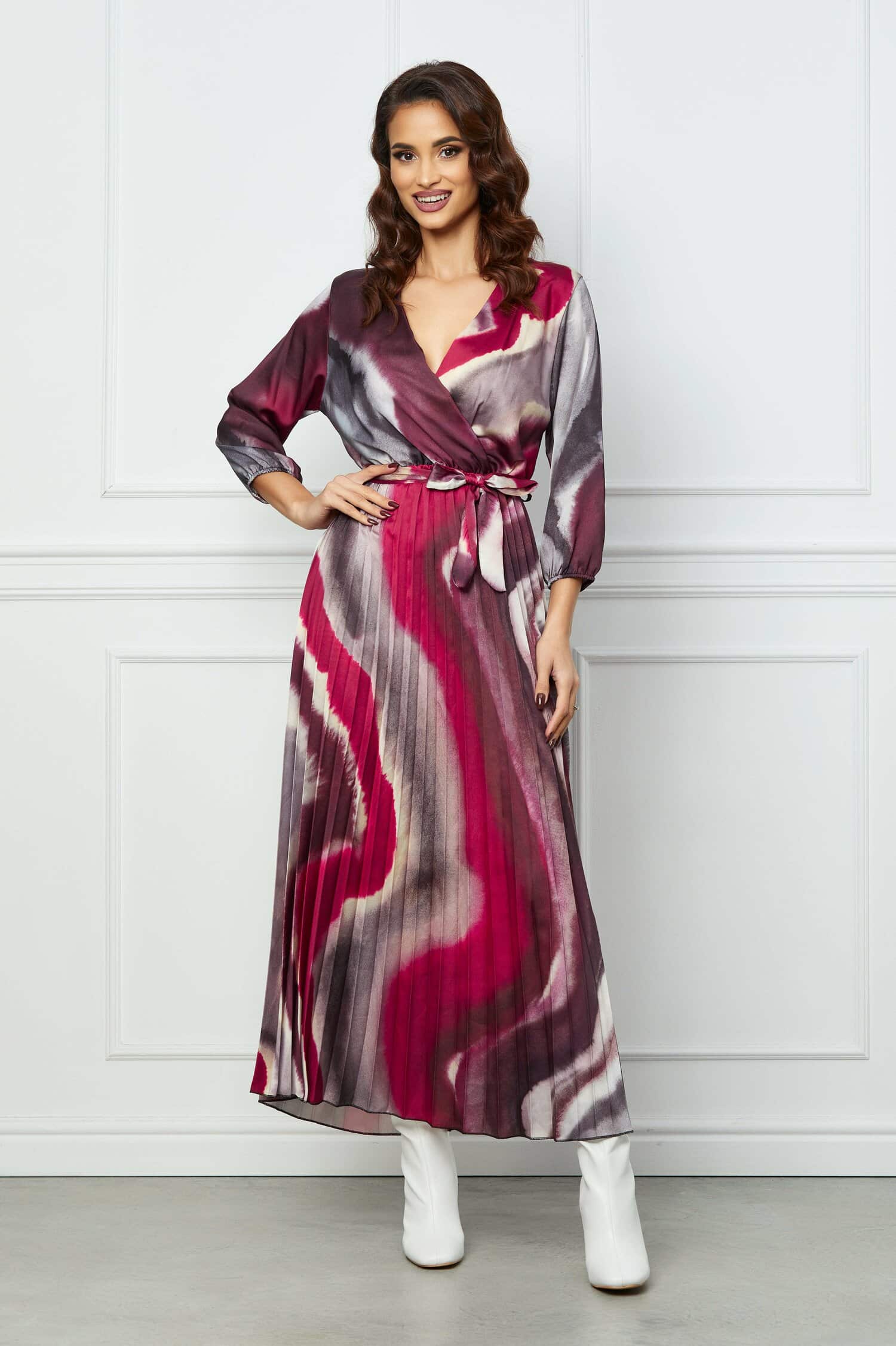 Specification: Rochie Ioana cu imprimeu watercolour gri-bordo