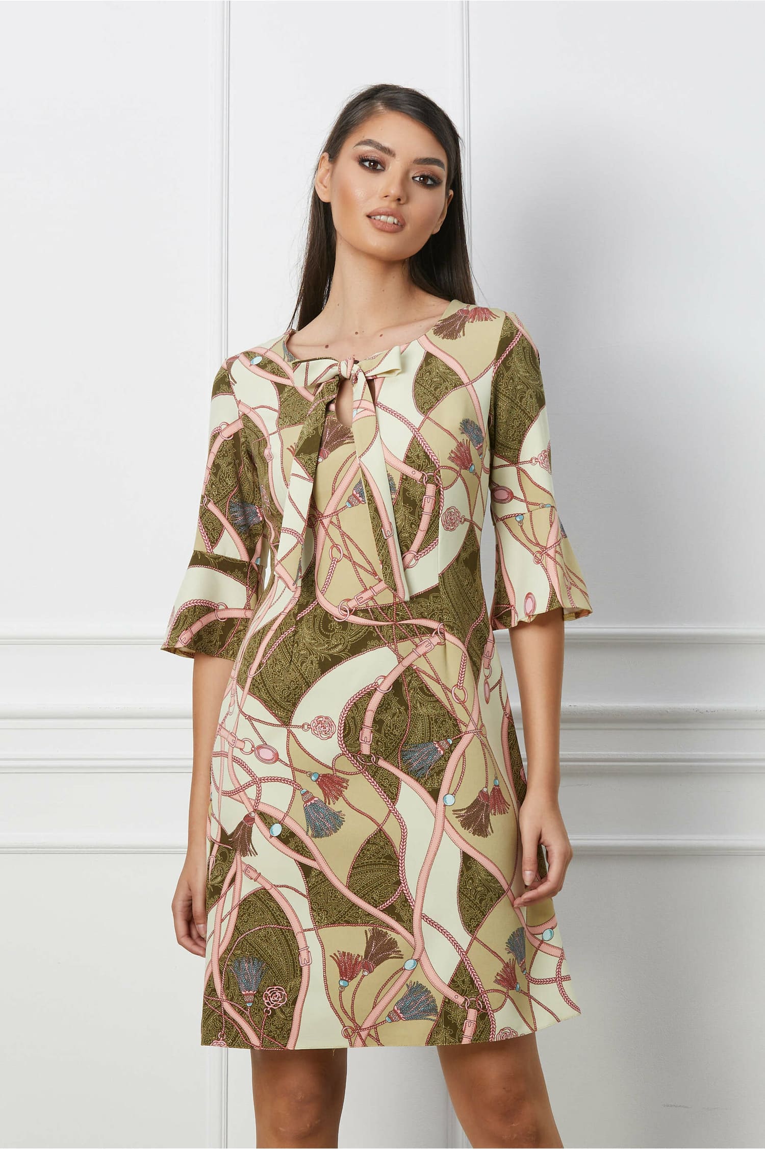 Rochia Ira iti va accentua feminitatea si eleganta in orice context! Aceasta are croiul usor lejer, in linie A, manecile trei sferturi evazate la baza, iar decolteul rotund cu decupaj este accesorizat cu benzi tip esarfa. Rochie eleganta Imprimeu Maneci trei sferturi tip clopot Decolteu rotund cu decupaj Fara captuseala Inchidere cu fermoar la spate Material: Stofa Compozitie: 95% Poliester, 5% Elastan Instructiuni de intretinere: *Va rugam verificati eticheta produsului inainte de curatare! *Pozitia tiparului imprimeului poate fi diferita datorita taierii. *Modelul are inaltimea de 174 cm. *Va rugam sa retineti ca o usoara discrepanta de culoare ar trebui sa fie acceptabila datorita luminii si luminozitatii ecranului. *Va rugam verificati ghidul de marimi, in cm, pentru a alege corect marimea.