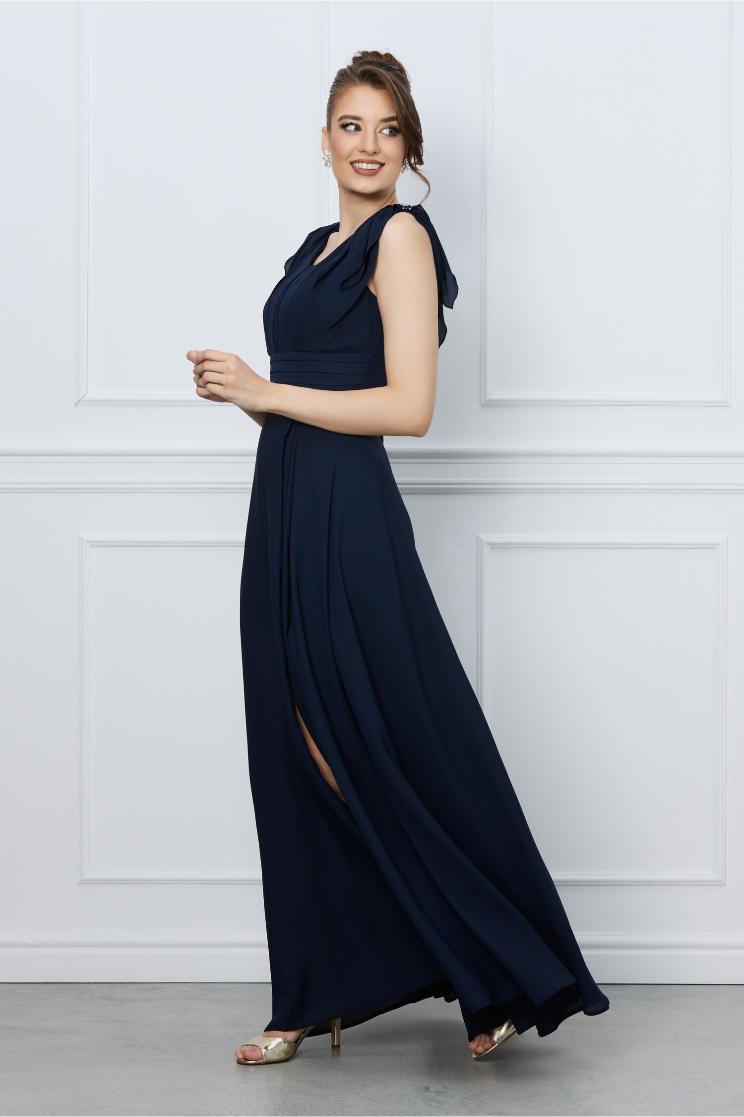 Specification: Rochie Irene bleumarin lunga cu volane pe umeri