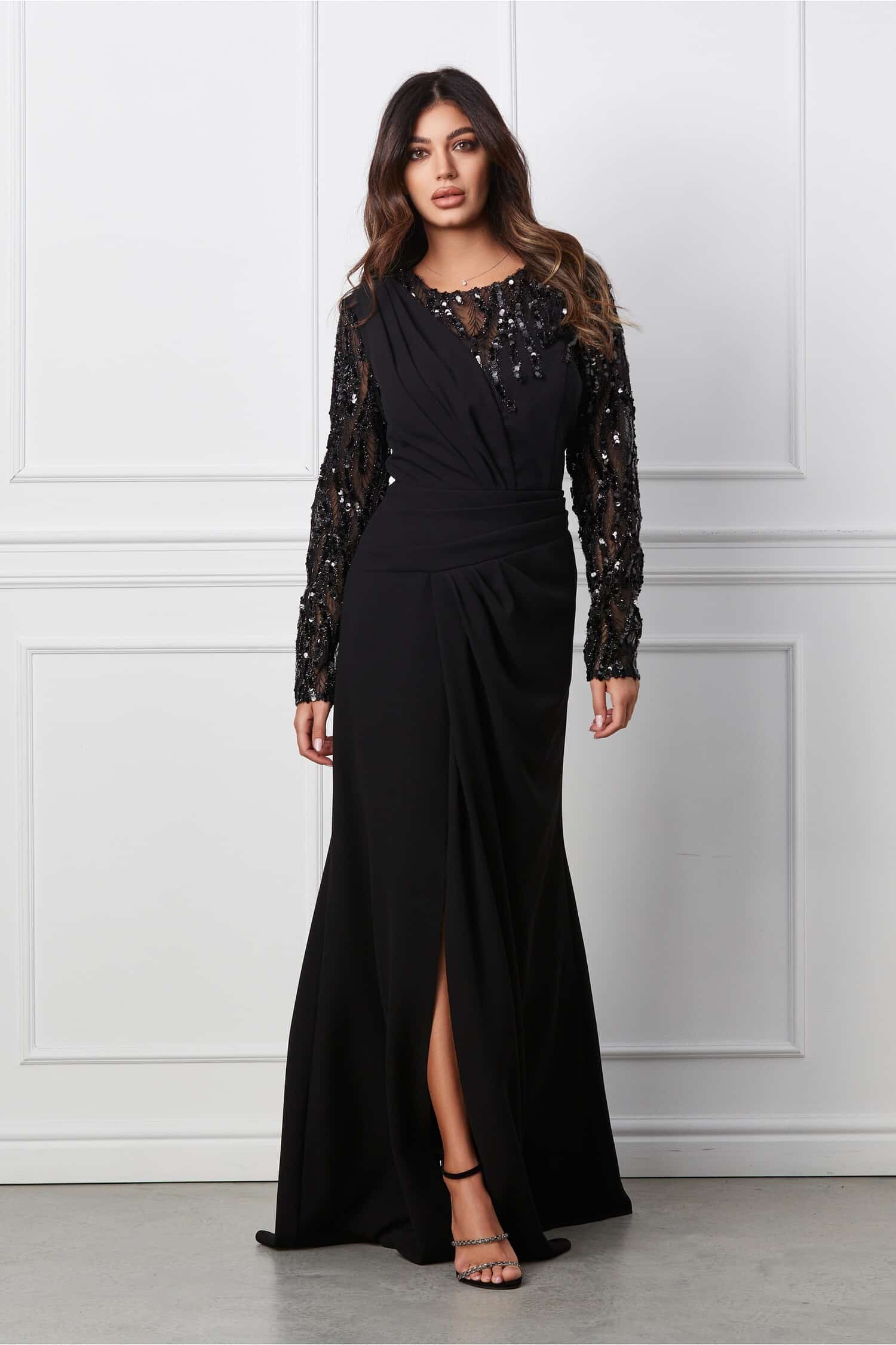 Specification: Rochie Irma lunga neagra cu paiete pe bust